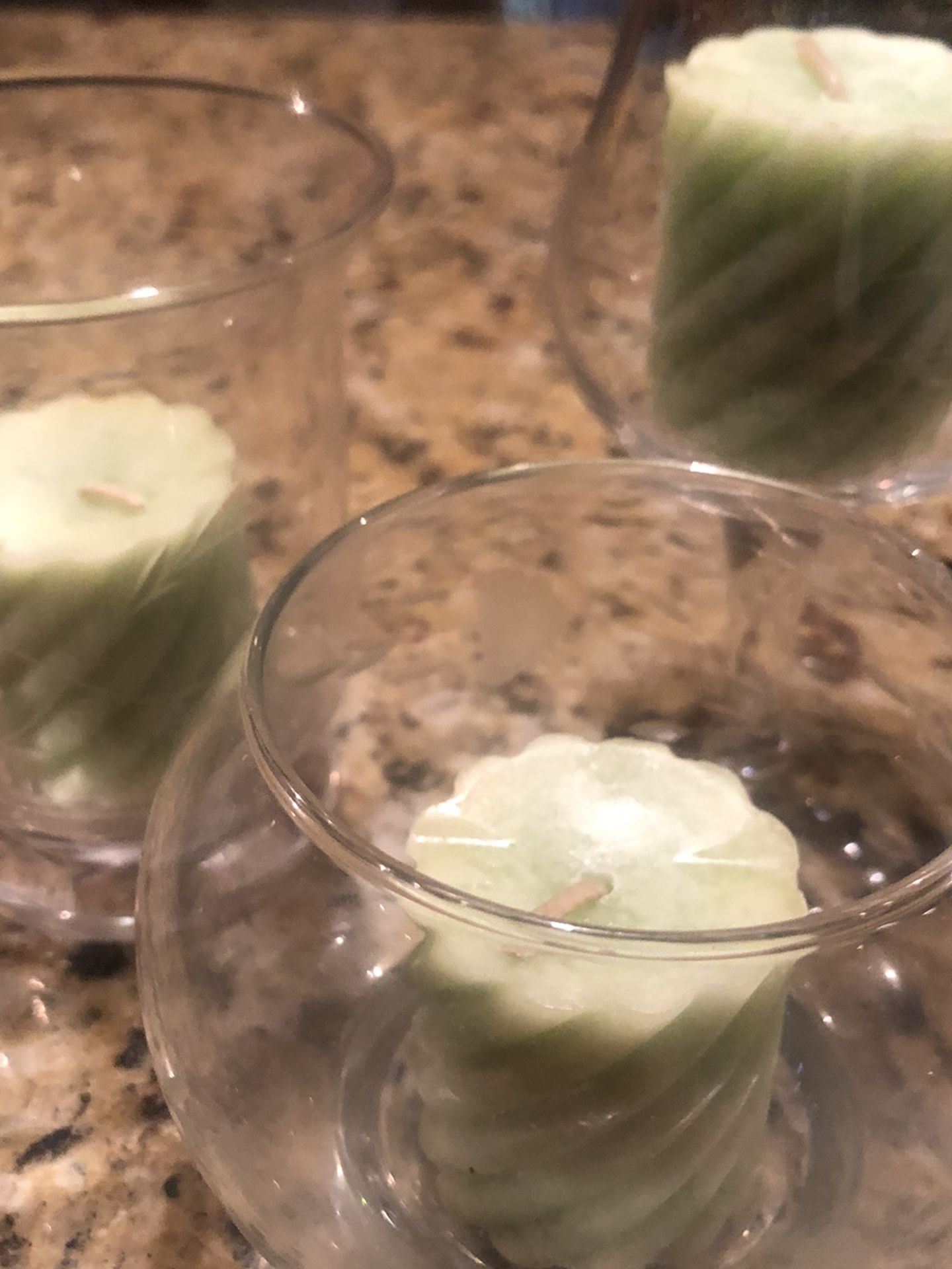 3 different shape candle holders from princess house with scented candies ( cucumber) smell 20.00 for all . A small glass apple from princess house 20.00 .
