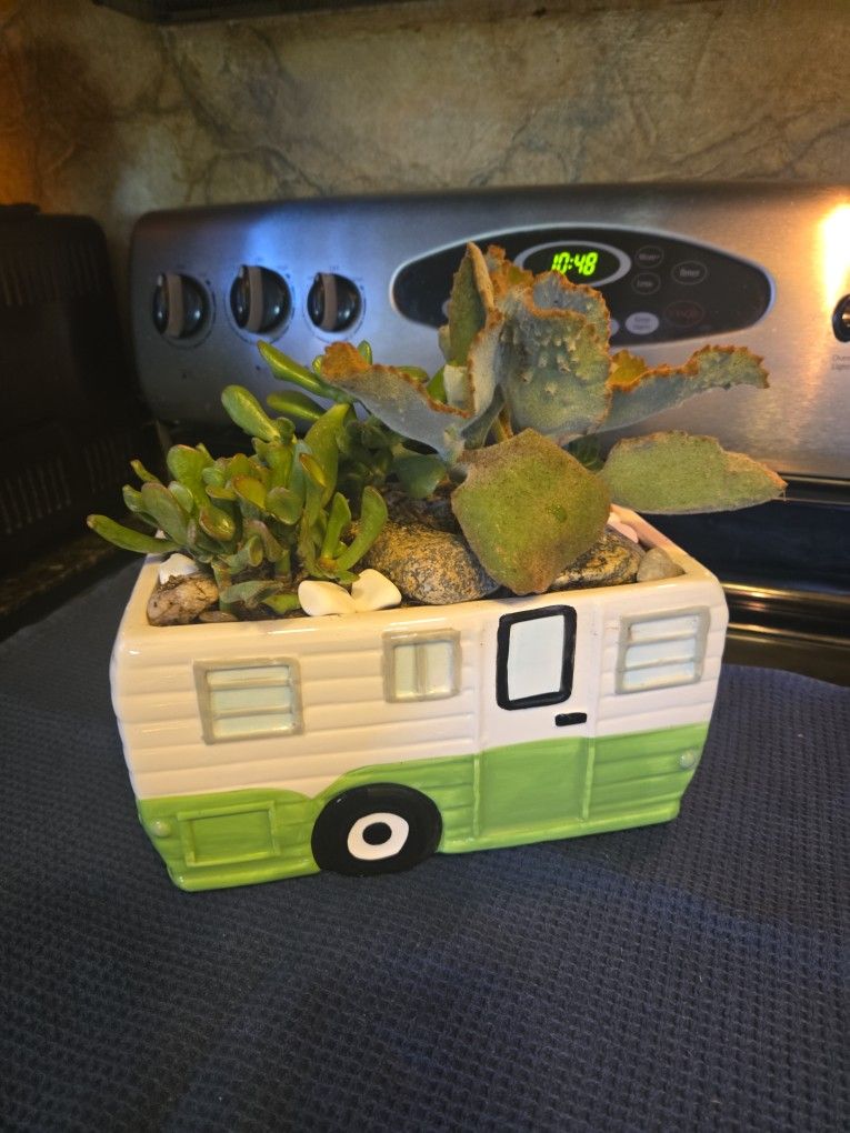 10in Ceramic Caravan Planter With Live Succulents And Cool Stones