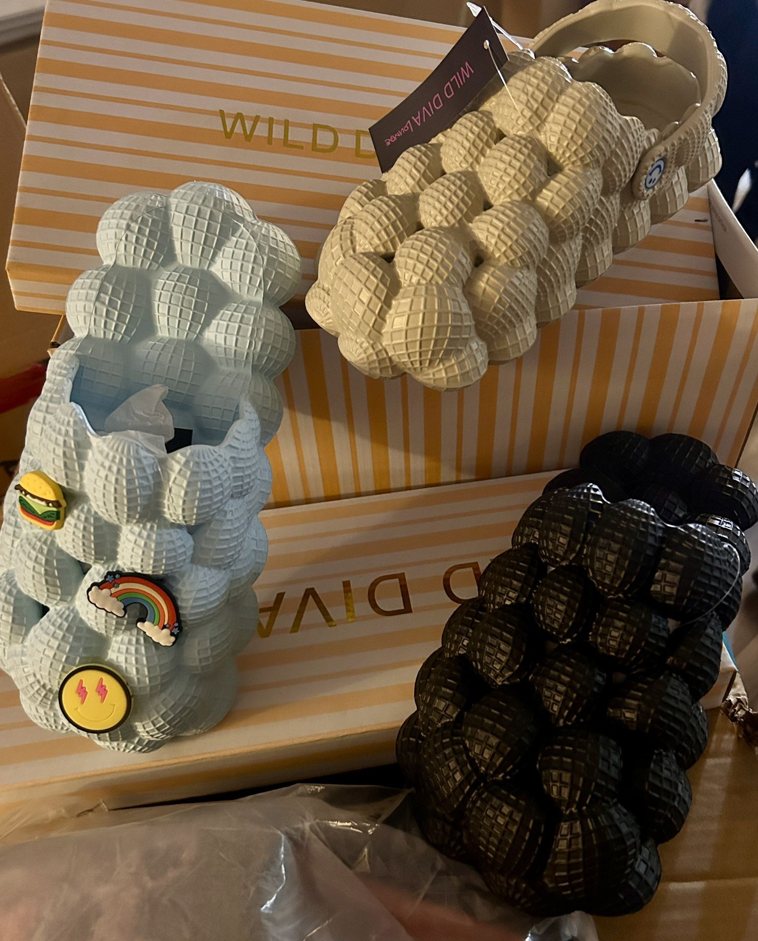 I have multiple pairs in black, light blue, and beige. With and without charms. The charms are removable. Sizes 6 through 9. Half sizes available