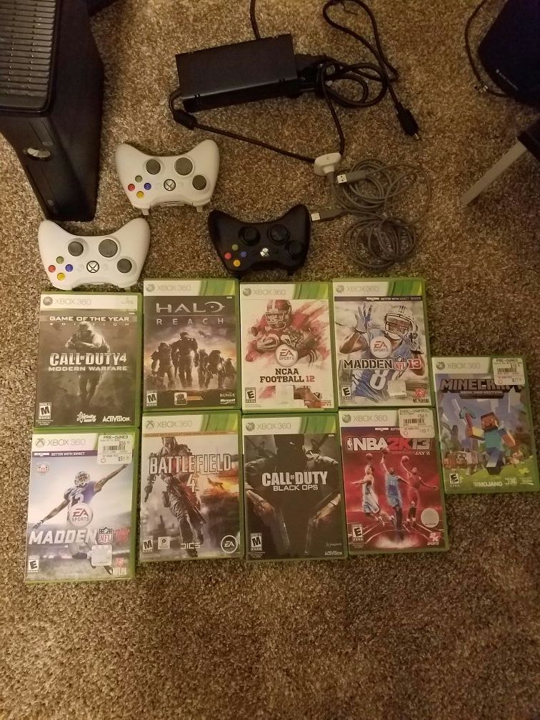 3 controllers and 16 games. Works perfectly. Slim edition kinect 8gb internal with 250GB expanded hard drive. Take it home for $140. Thanks!
