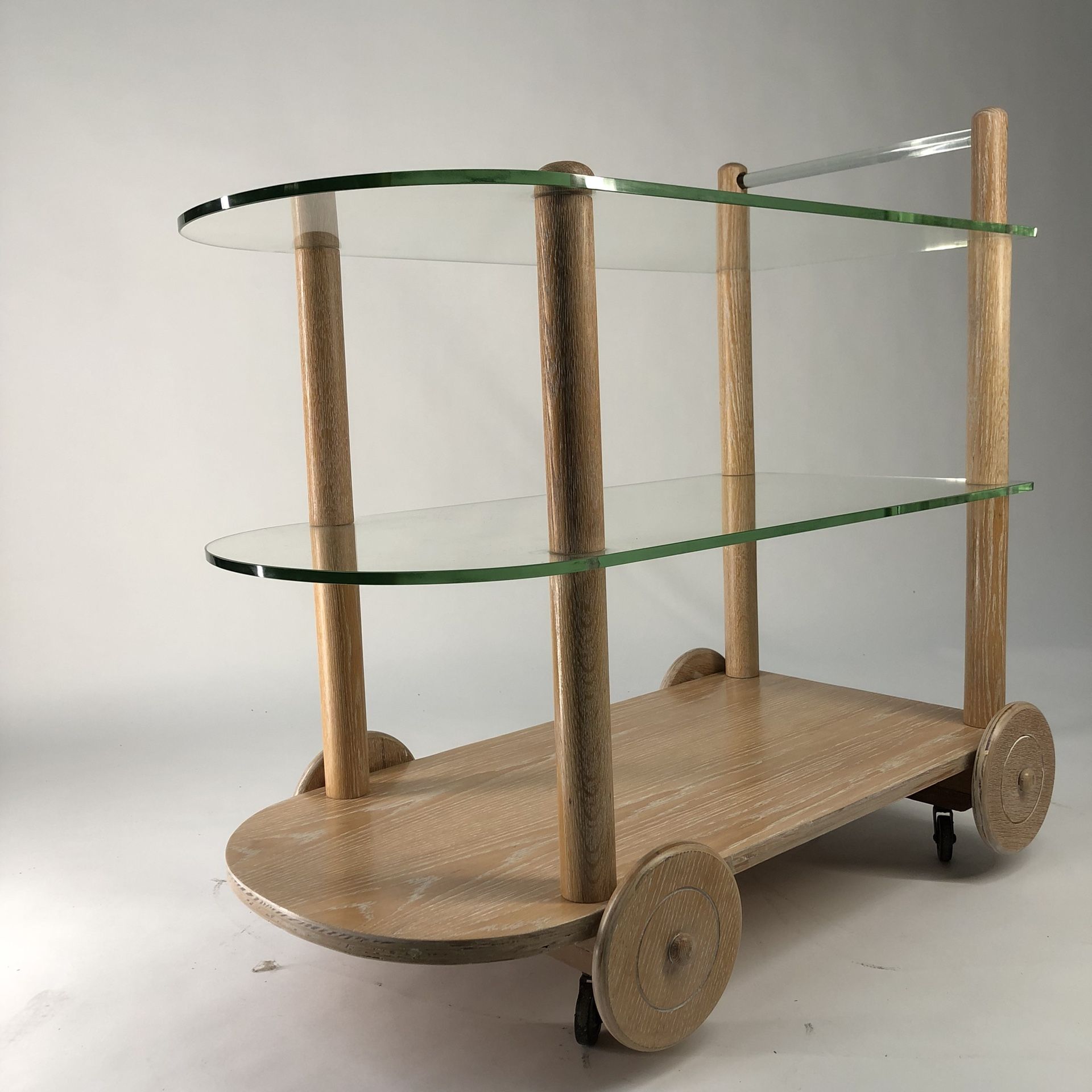 Cerused oak and glass bar cart. Newly restored. Unmarked with no labels. Newly refurbished. 1940's era. Wood is in excellent condition, minor scratches on original glass.