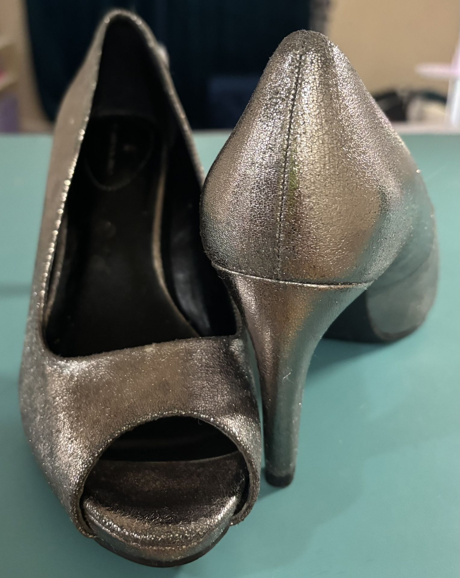 Shimmering Dark Silver Open Toe High Heels, Size 8