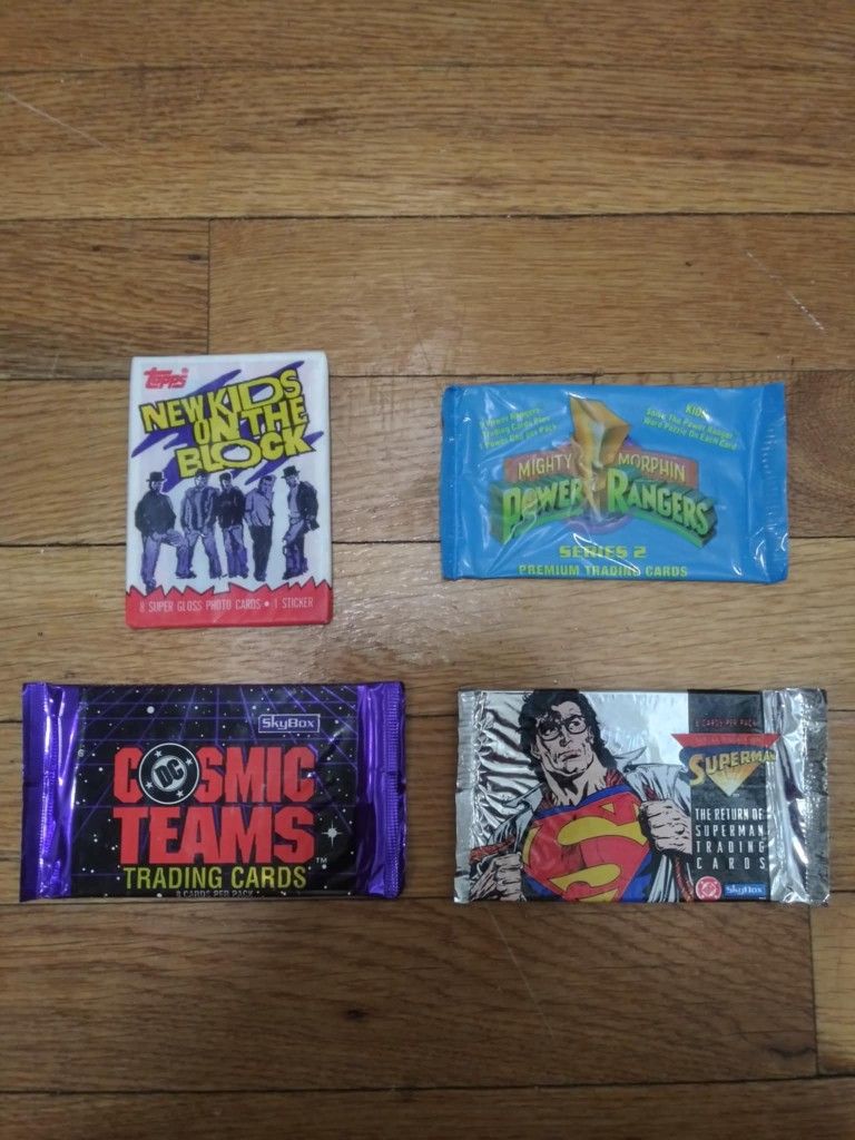 4 Sealed Late 80s Early 90s Packs Of Cards Like Superman, Power Rangers, NKOTB, And Cosmic Teams. Message me anytime if interested will send more pictures or videos thank you.