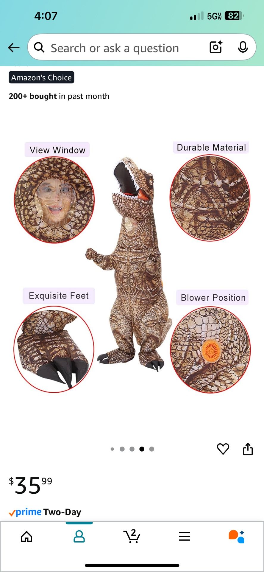Costume fits 160-185CM(5.2-6FT/62.99-72.8 INCH) tall adults and teens. Has elastic in the wrists and ankles to create an airtight seal and keep air from escaping Inflatable trex costume can be inflated fully within one or two minutes with the built-in fan. Use 4 AA batteries or connect it to a USB portable charger to keep the dino costume inflated