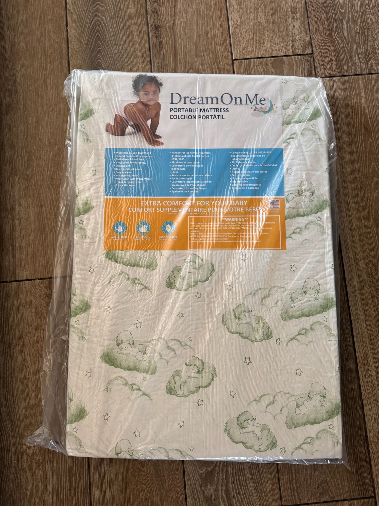 New, Mini Crib 3” Mattress Dream on Me 26 X 38 Still in box and plastic wrapped Vinyl Cover - cleans easily Waterproof Hypoallergenic I have several of these $20 each