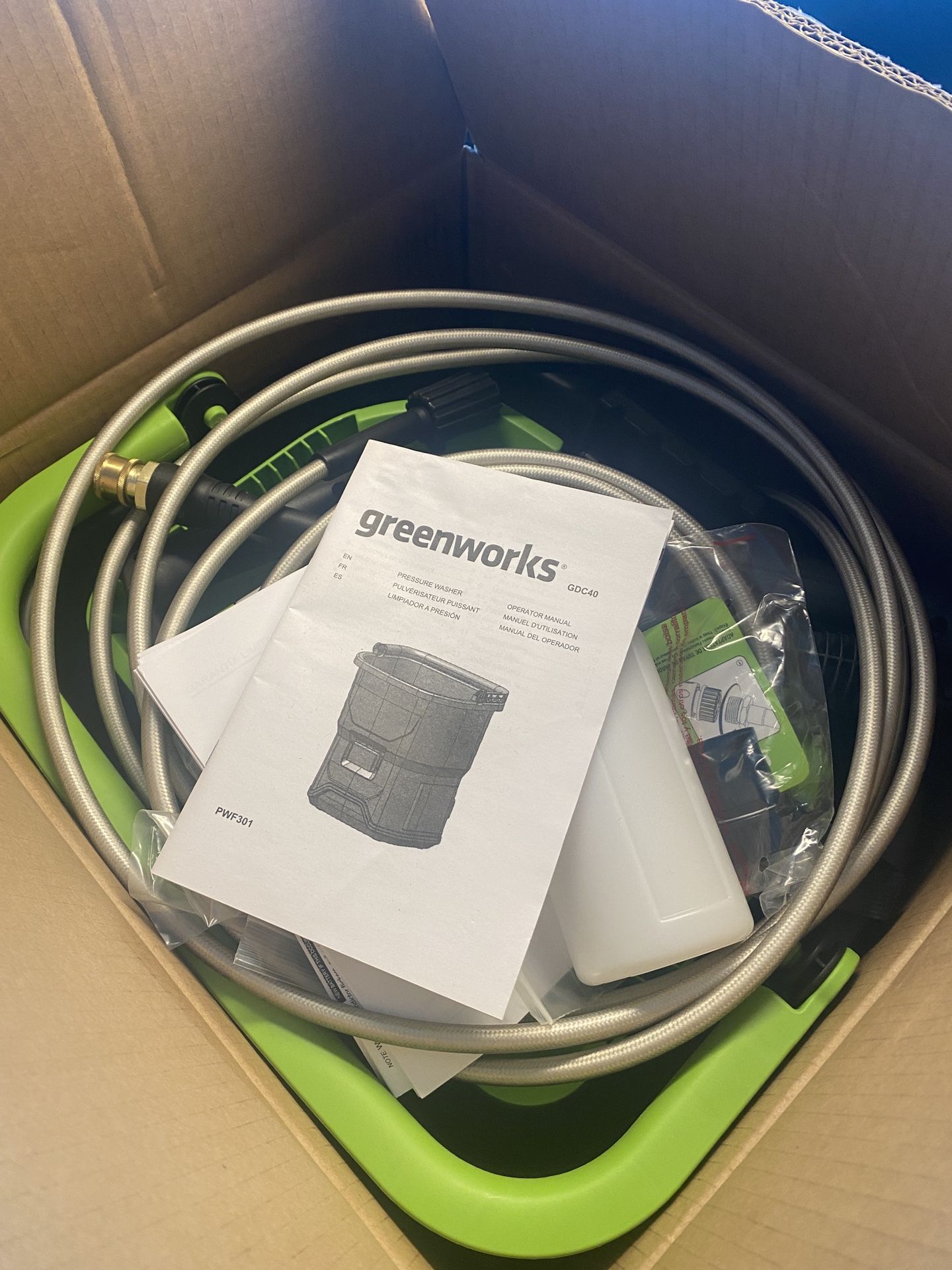 The Greenworks 40V cordless pressure washer features 800 PSI, quick connect wand comes with soap dispenser, 25°, 40° nozzles, removable bucket with handle for external water sources, 40V 4Ah USB battery, 3-year tool and battery Greenworks - 800 PSI 40-Volt Cordless Bucket Pressure Washer (4.0Ah Battery and Charger Included) - Black/Green