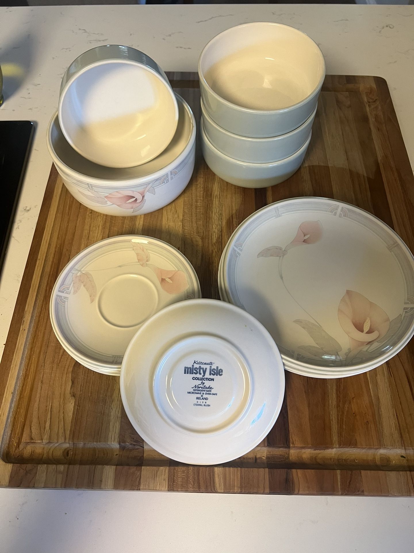 6 dinner plates, 4 cereal bowls, 4 salad plates, 3 desert plates and one large serving bowl. Some salad plates have small chips. Asking $50 for the set. Dinner plates go for $20 per plate, I’m asking $50 for the set