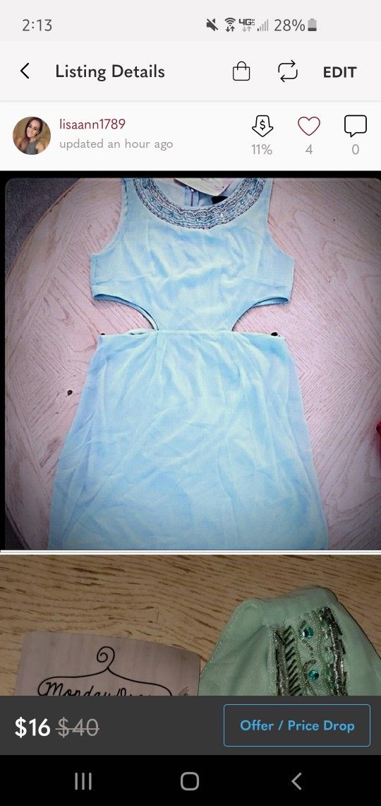 Baby blue side cut out dress. Beaded neck. Never worn. With tags. Originally bought from online boutique Shop MondayDress for $40. Asking $32 OBO. Will ship.