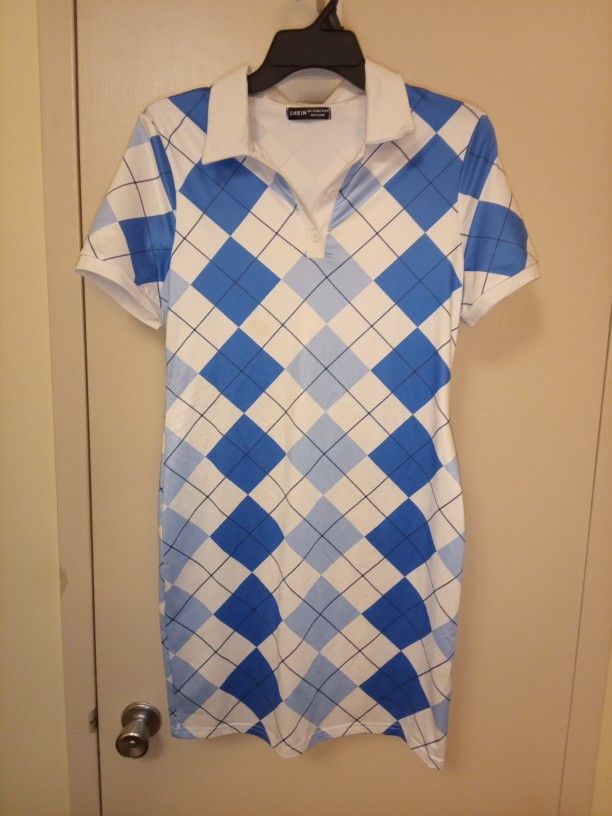 Comfy SHEIN polo dress. Has a super cute blue and white argyle pattern. Size L, fits US 8/10. Great for casual days or a fun outing. *Even though tag indicates dress as being a size large, it actually fits more like a US medium. *Will work with you on price...only if seriously interested in purchasing, AND are willing to come to me in order to prevent shipping item.