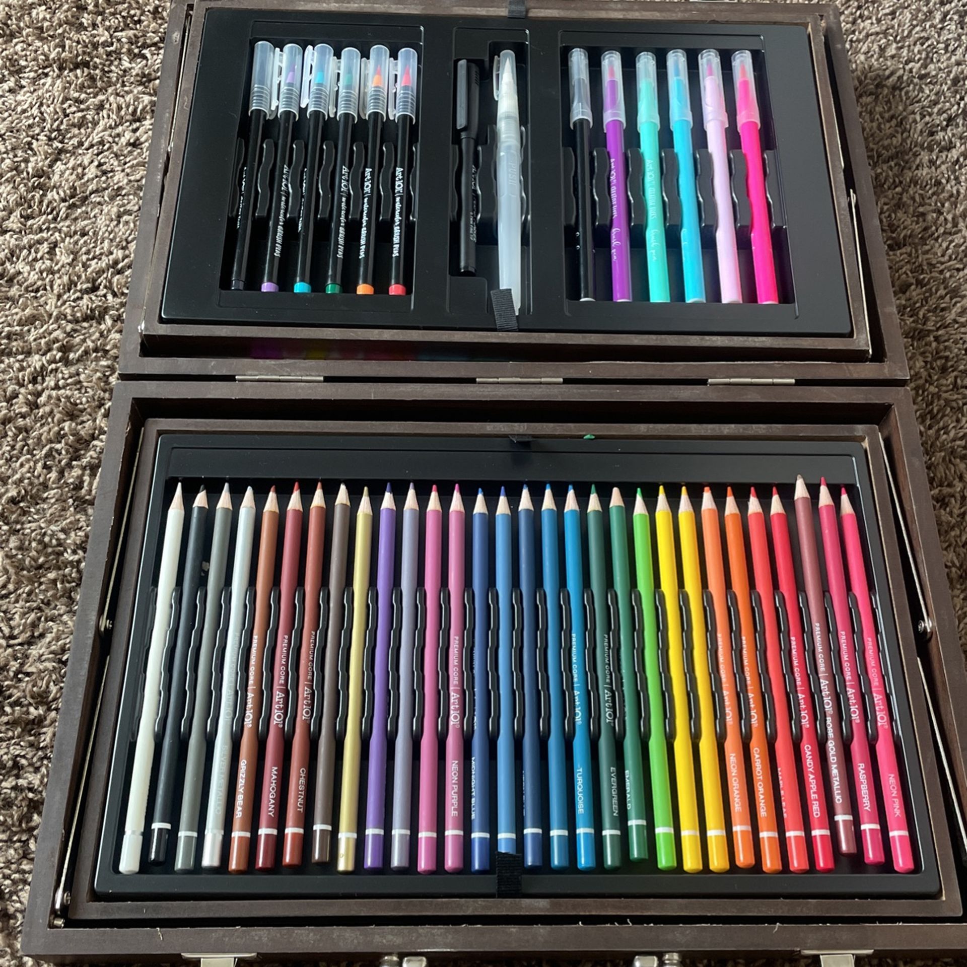 Art kit, color pencils, markers , water markers , acrylic paint , canvases