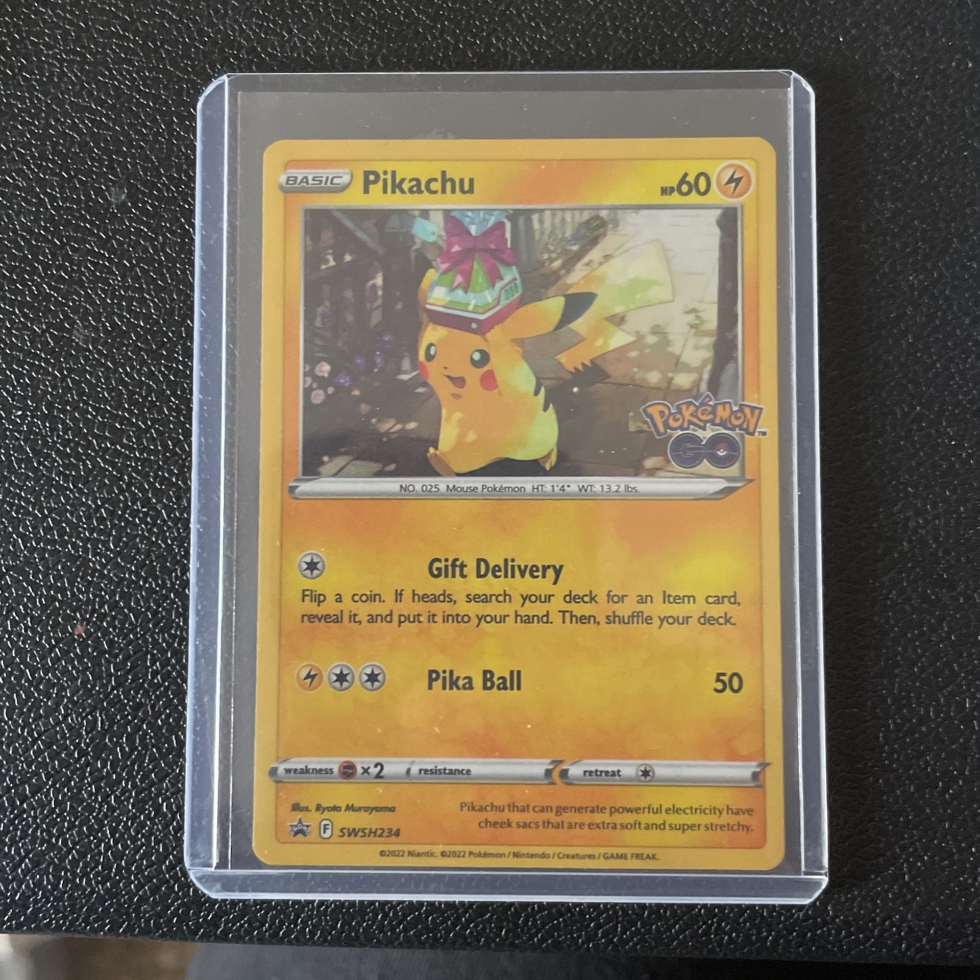 Pokemon go promo card featuring Pikachu holding a gift . SWSH234 Pulled and immediately penny sleeved and top loaded Looking to trade for bulbasaur ,Charmander, or squirtle promo cards holding the gift from the Pokemon go set . Working on finishing up master set for Pokemon go . Need #71 through #88 as well as promos mentioned above . Thanks for reading .