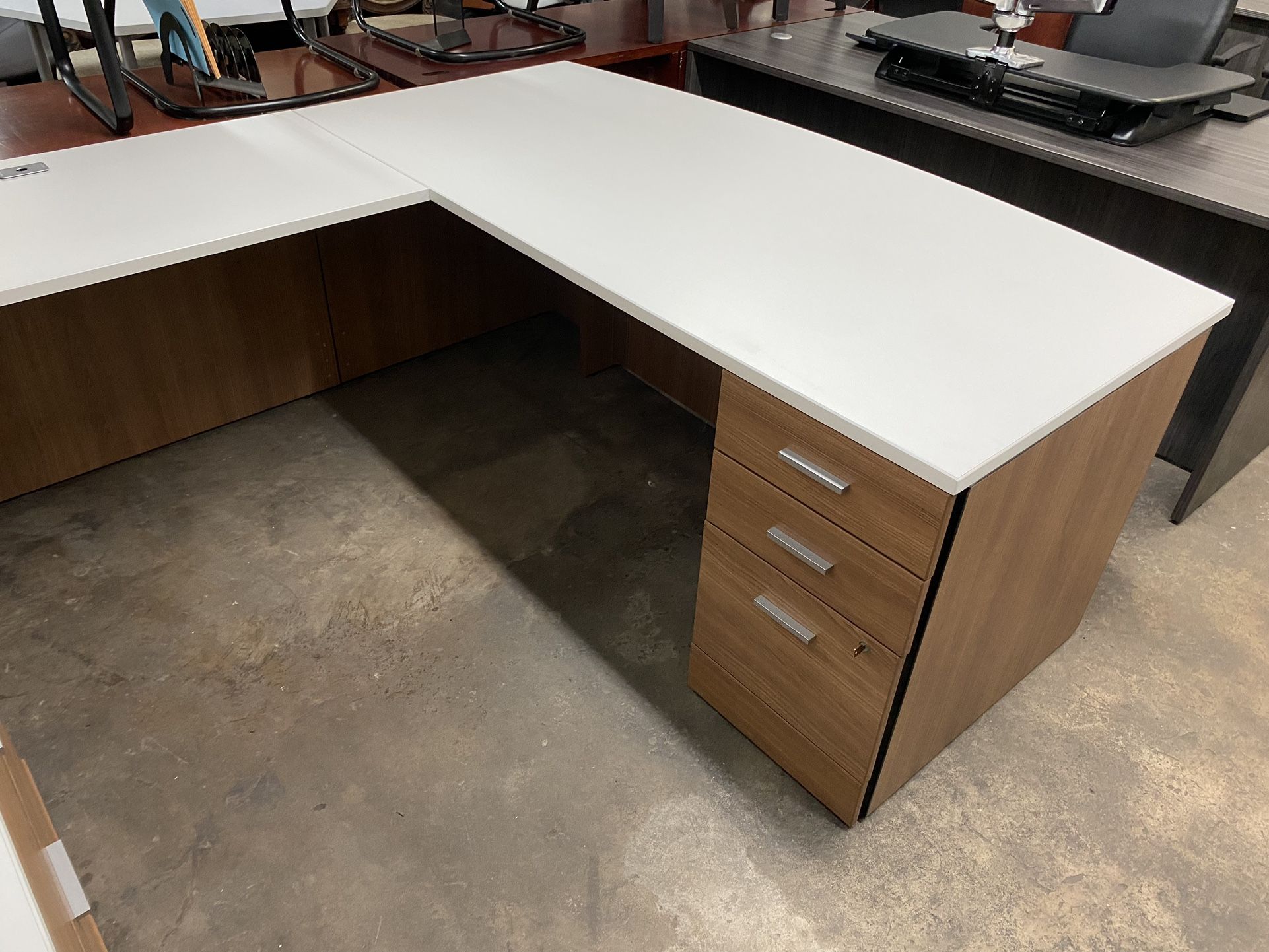 Teknion L Shaped Desk, commercial grade heavy duty, bow front desk, one cabinet with lock, wire grommet, dimensions 6’ front x 6.5’ left right side
