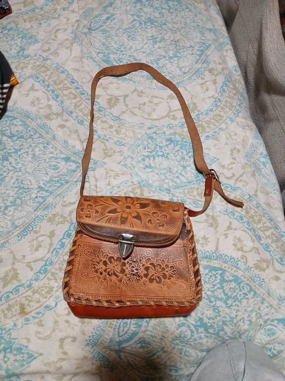 Vintage-style hand tooled Leather crossbody Mexican made purse