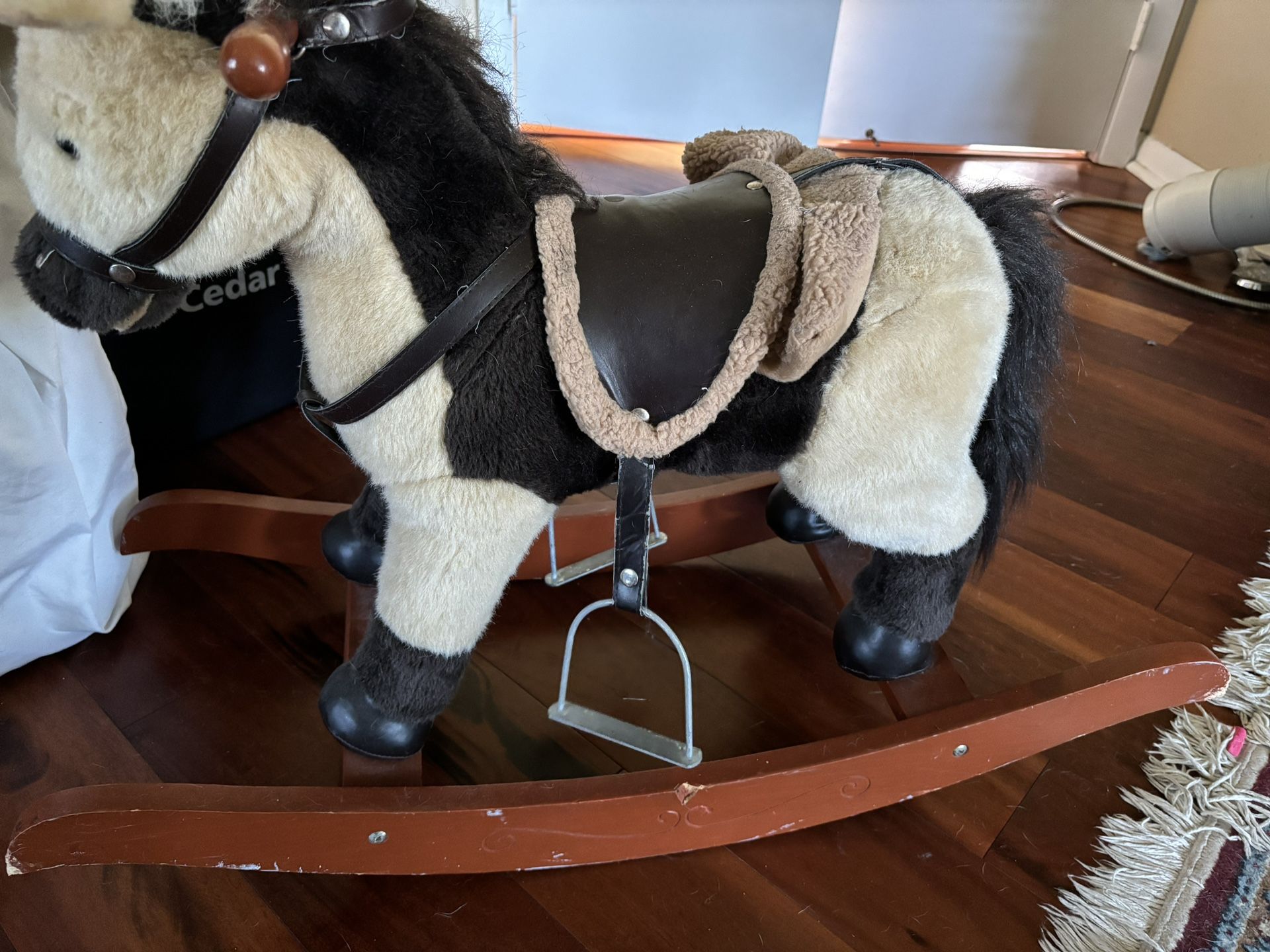 does not make sound and is chipped here and there on the wood part. Fostered a pup awhile back and she chewed on the edge as well. but has no other issues and rocks perfectly.