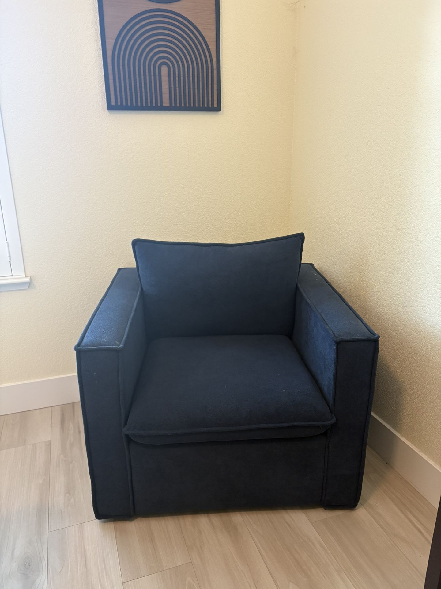 Navy Blue swivel chair. Great condition. Sits in the corner of a room unused.