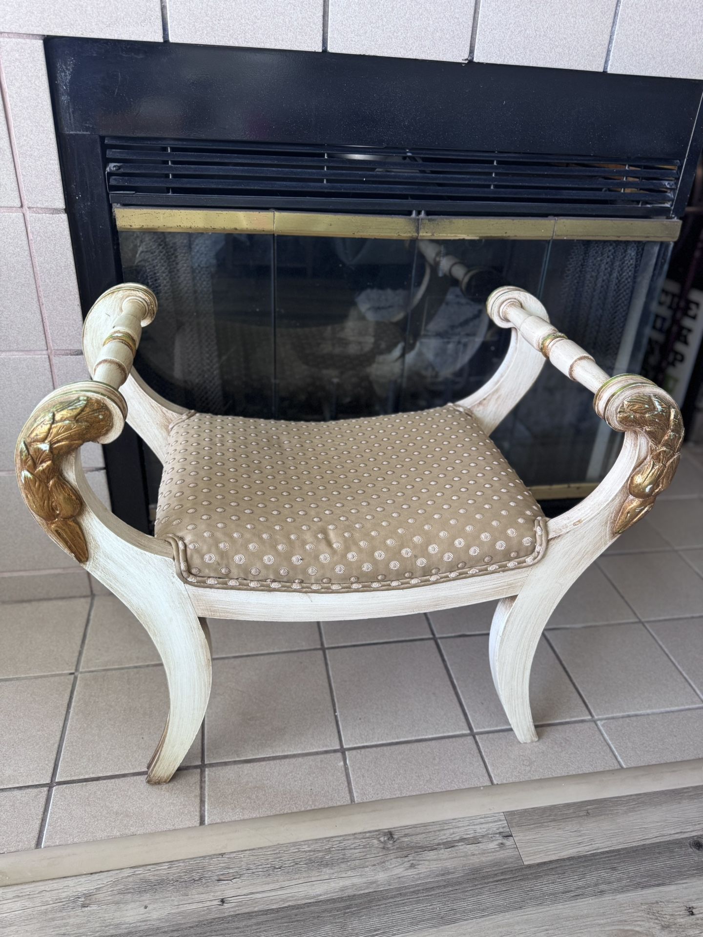 Vintage antique French empire Directoire Style Bench. This lovely French Directoire bench or stool painted a white and gold color with gold handle accents, upholstered . Sturdy frame. This is a beautiful vintage piece. Please make a reasonable offer.