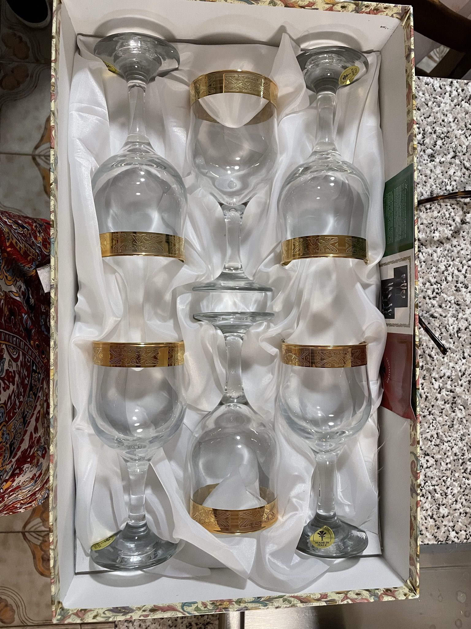 6 pristine glasses with gold trim and in the original box. Made in Italy by Cristalleria Fratelli Fumo.