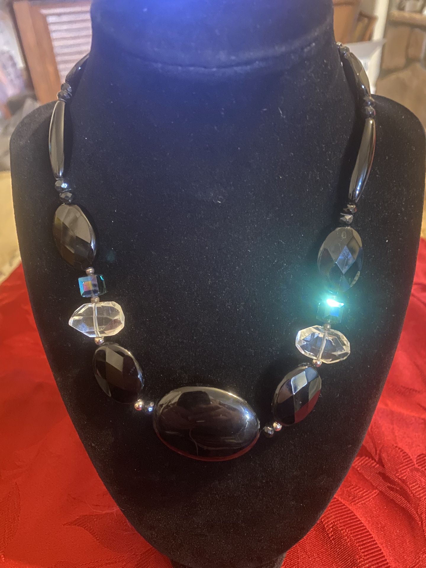 Stunning vintage black and clear oversized beaded necklace, with AB square crystal beads. With a beautiful silver clasp.