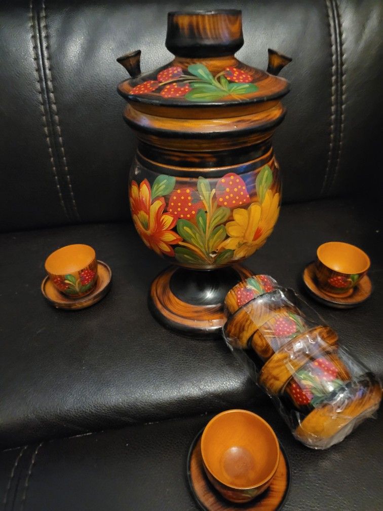 Hand Painted Wooden Vase With 6 Wooden Tea Cups