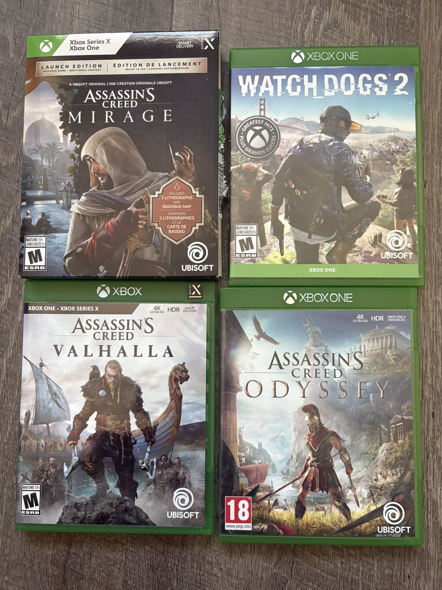 Xbox series x/xbox one New Watch Dogs 2 & Assassins Creed Bundle 4 Game bundle Includes: New sealed Watch Dogs 2 Assassins creed odyssey Assassins creed Valhalla Assassins creed Mirage Launch Edition Excellent condition. Offers welcomed