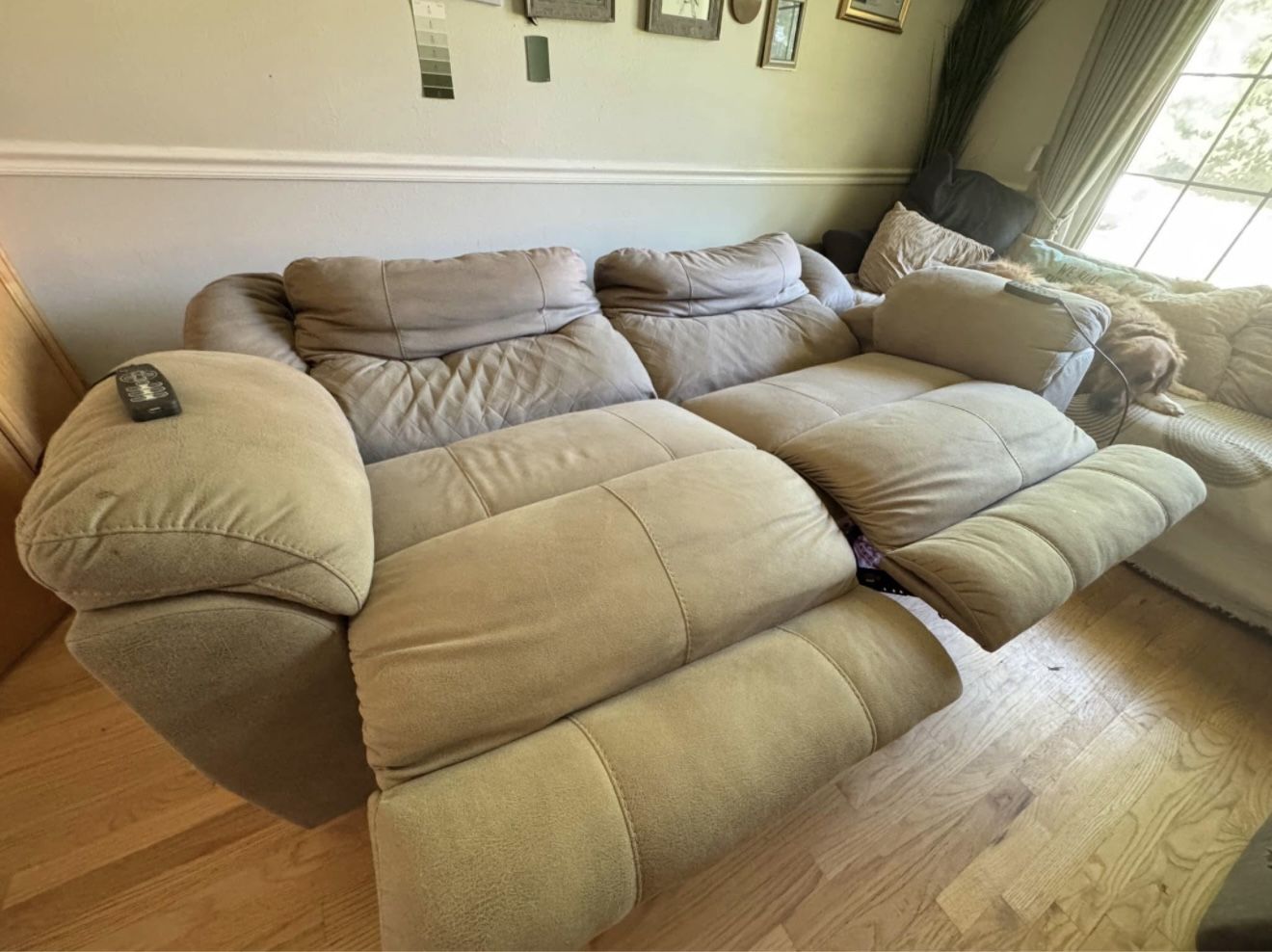 *MUST PICK UP* Width 89inches Non reclined length 35inches Height 38in Fully functioning, double recliner! Fully reclines "cat nap" style. Heated seat option, massage option, lumbar support, head and foot can be reclined and positioned separately Condition is pretty much new NO STAINS OR TEARS We love it, but need to clear some space.