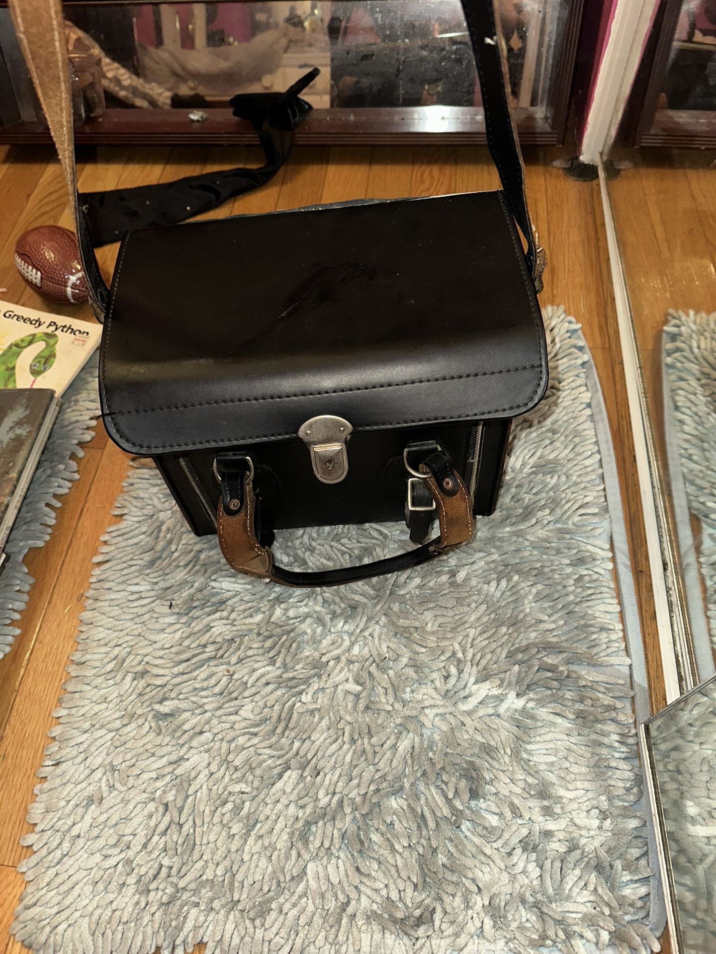 Vintage large black leather Camera, Hard Case With Apartments And Handle Japan.