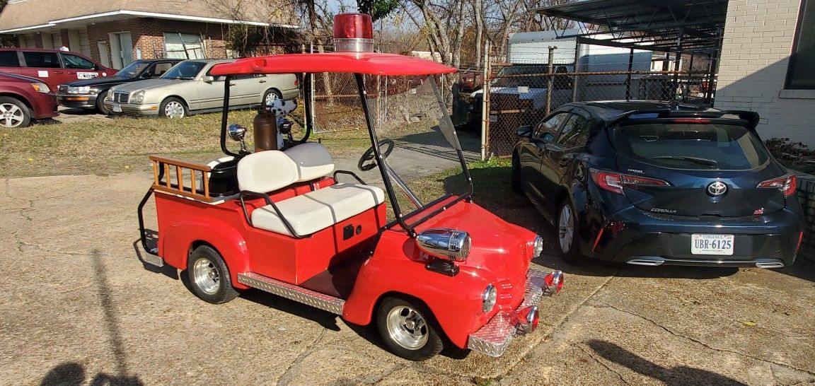 Completely reconditioned custom Firetruck replica golf car. All accessories collected from vintage fire trucks. Electric includes batteries and on board charging system. All lights and sirens operational.