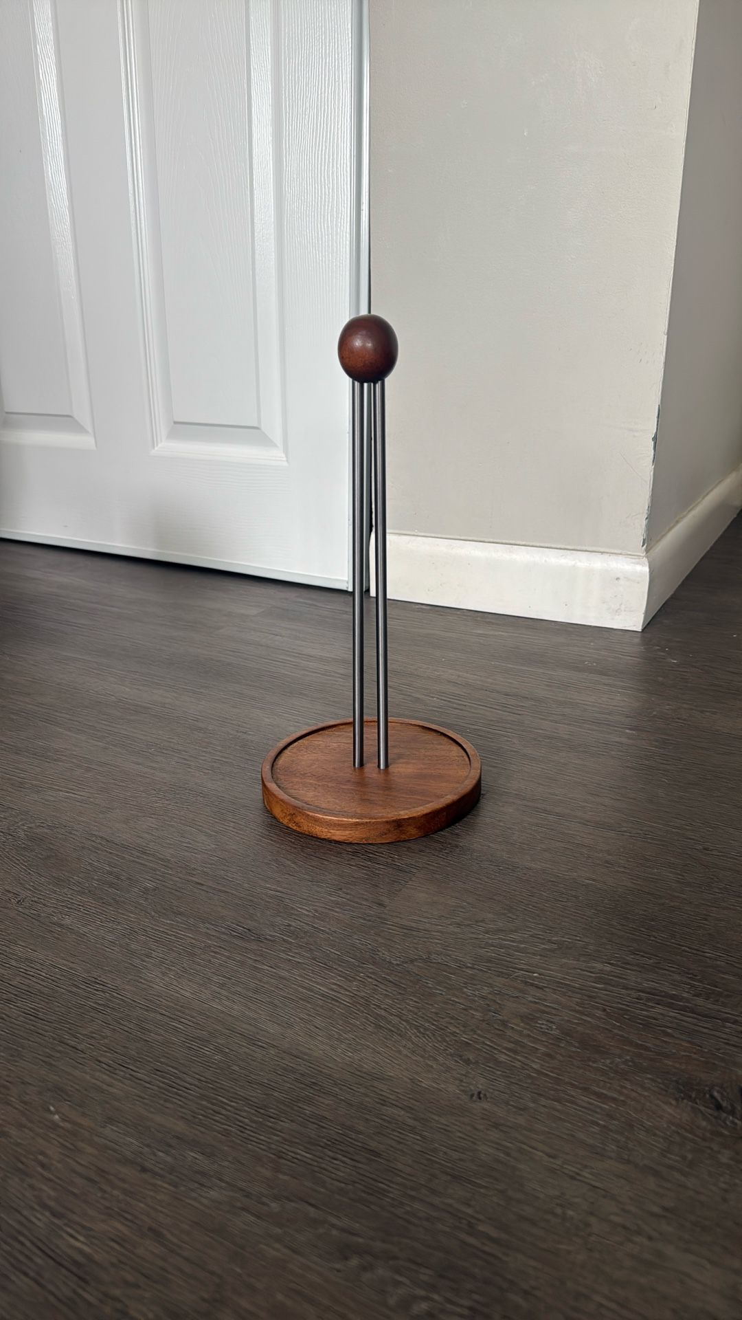 Modern paper towel holder with a solid wooden base and sleek metal rods. Sturdy and well balanced. Neutral wood tone. Fits standard paper towel rolls Great condition