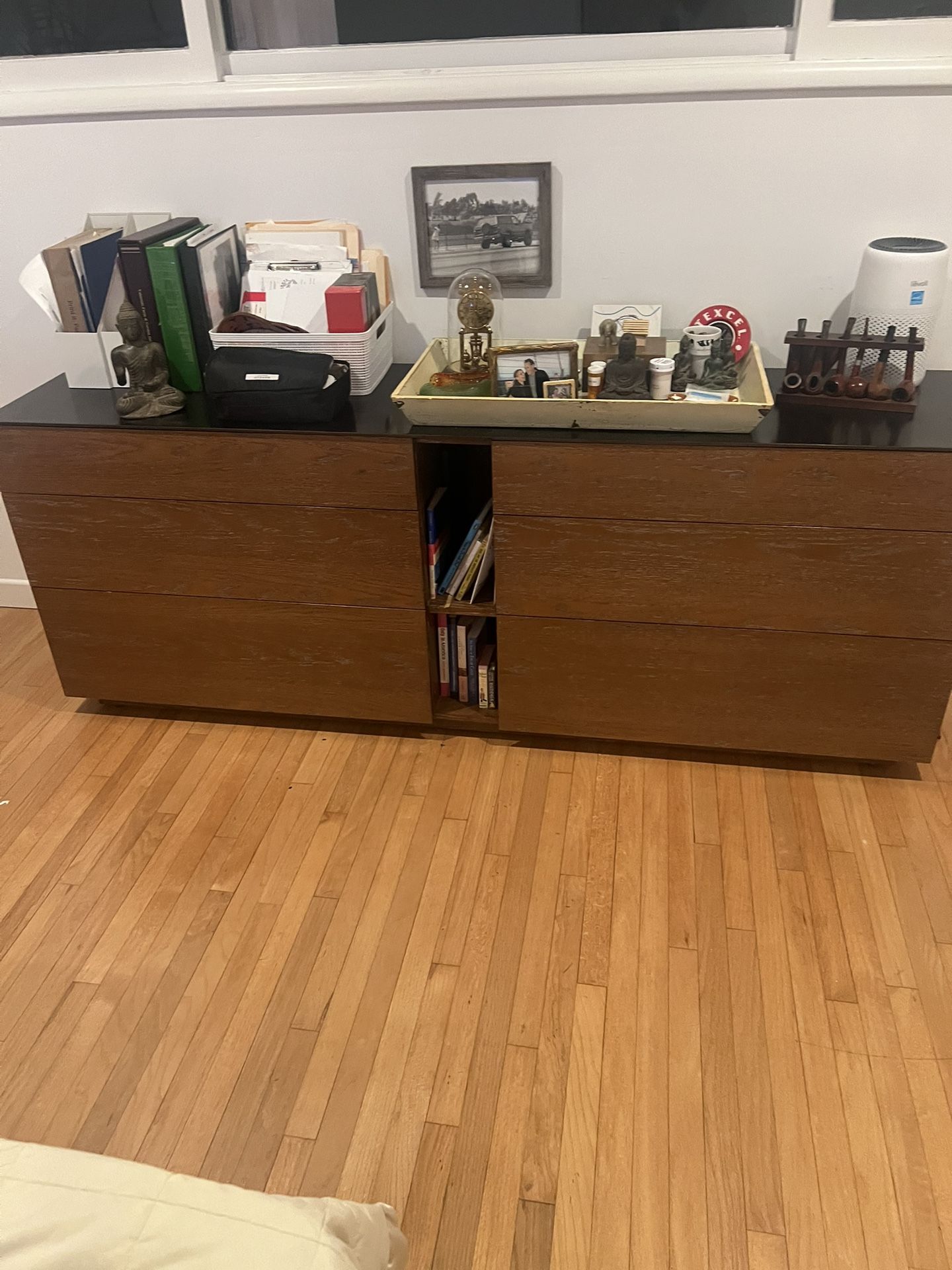 2 high-end modern dressers with steel tops. These are as strong and stable as the day we bought them. Very well built pieces. Six drawers each with cubby holes for books. Large dresser, 72 small dresser 60 both 18 inches deep 30 inches high. 250 for the small one 300.