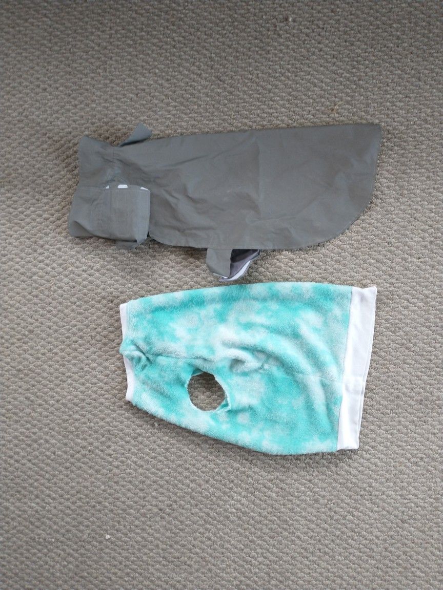 Grey large dog rain jacket in all reflective with leash access and Velcro closure. Mint Fleece dog coat in large. **Reflective jacket has a tiny tear on under side , my dog did a little nibble. Both are great, our dog just won't wear them