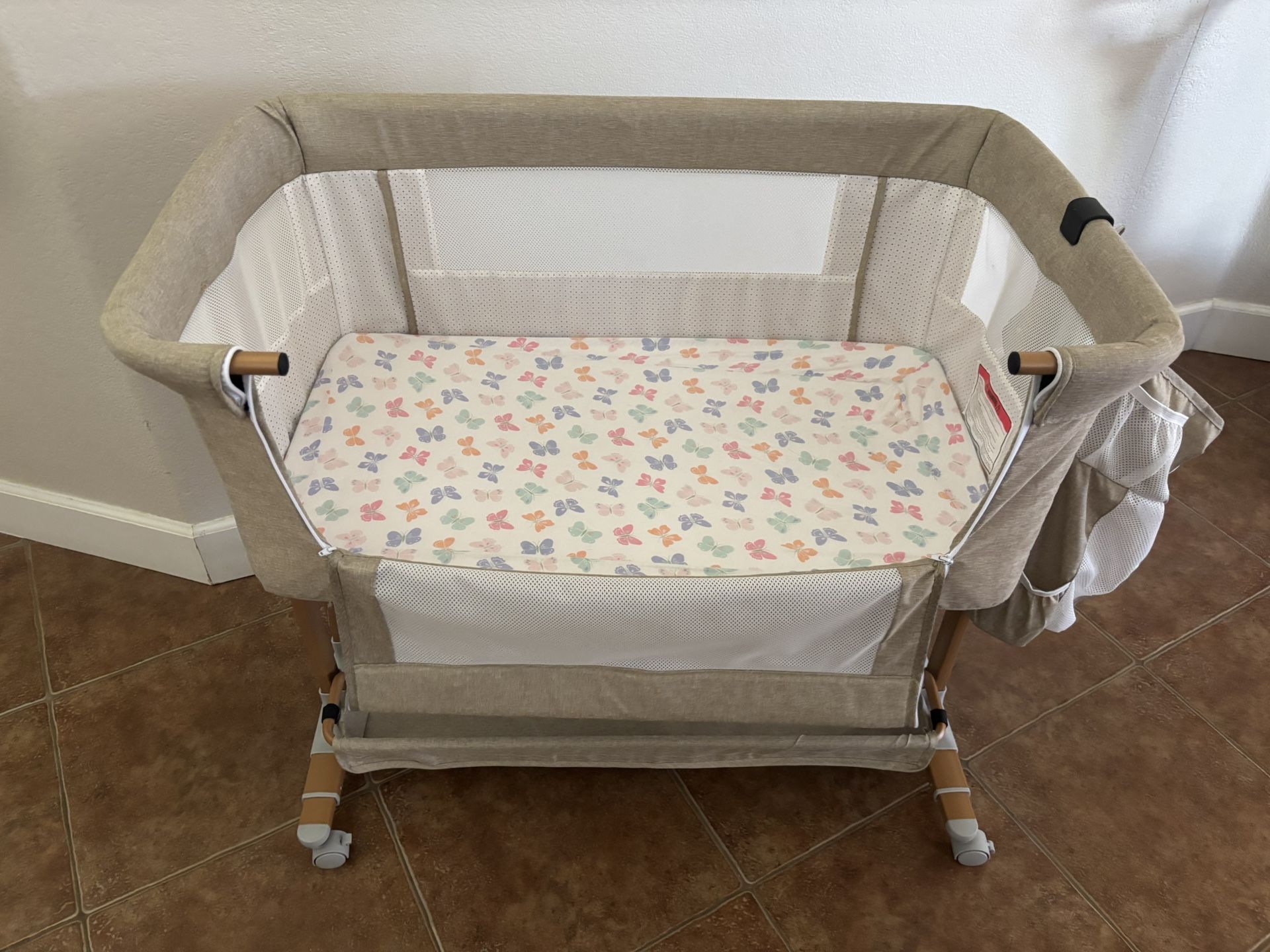 Baby Bassinet Bedside Sleeper 2 in 1 with Wheels with Mattress, Incline Option, 6 Adjustable Heights for Newborn to 8 Months Color Gold Brand bicystar Product Dimensions 36.6"L x 21.3"W x 35.4"H Material Metal Furniture Finish Oak Maximum Weight Recommendation 20 Pounds DUAL DELIGHT DESIGN - Transition seamlessly from a secure standalone bedside bassinet for baby to an intimate bedside sleeper with a drop down side, allowing for close bonding with your newborn up to 6 months. Rejoice as comfort meets convenience in your nursery! ELEVATE COMFORT - Elevate your nursery with 6 different height settings, making this baby bassinets bedside sleeper from 17.7" to 23.6" to align with any adult bed, ensuring your little one is always within a loving glance. Experience blissful harmony and perfect peace of mind, night or dreamy night. UNMATCHED COMFORT FOR BABY - Cradle your little one on a 1.2" high-density foam mattress in this baby bedside bassinet, promising serene slumber. Top this off with a waterproof cover that shields the mattress from spills and accidents. EFFORTLESS MOBILITY - Glide your portable bassinet effortlessly with smooth, lockable wheels. Its easy portability allows precious moments room-to-room. Unmatched stability meets unrivaled convenience – ADD TO CART now. EASEFUL ASSEMBLY & PORTABILITY - Assembling this bedside crib bassinet is a dream — no tools, no fuss, just a few steps to welcome a cozy baby bed sleeper for your tiny treasure. Collapse it compactly for hassle-free travel anywhere, any time. PRACTICAL STORAGE SOLUTIONS - Stay organized with ample storage under the foldable and a handy diaper caddy. Keep all the infant must-haves for those surprising little moments that need quick action. TRANQUIL NEST VIEW - Embrace your little one in a serene bed sharing bassinet where panoramic mesh offers both a refreshing breeze and a full, peaceful view. Combined with a detachable mosquito net, slumber becomes an untroubled idyll, as you enjoy the restful comfort of a protected, visible slumber oasis. It has no tears or stains in excellent condition and is from a smoke free house