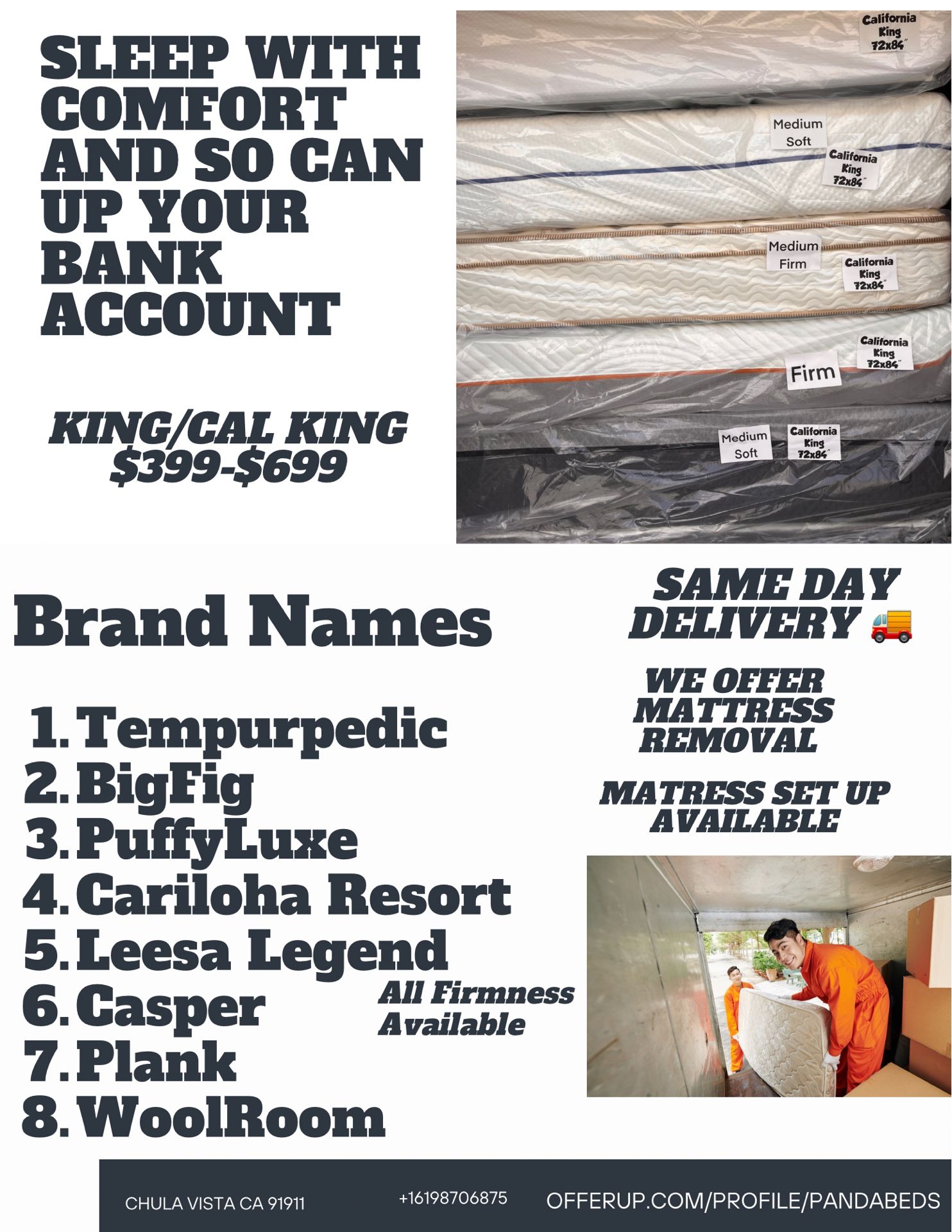 King cal king Name brand Starting at $399-$499 Same day delivery