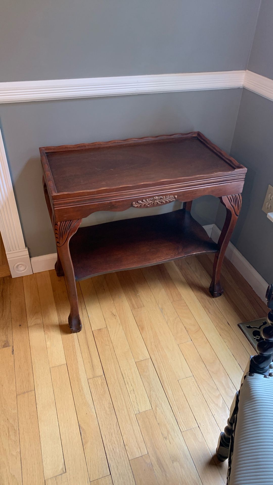 25”x14”. 23 1/2”high I have two of these tables. $20 each.