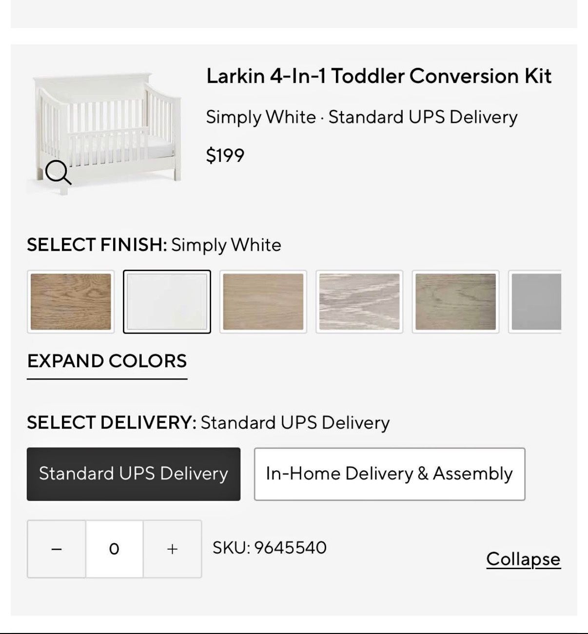 Pottery Barn Larkin Toddler bed conversion kit. This is only the conversion kit, not the crib! The box is opened, but it has never been used! Retails for $200.