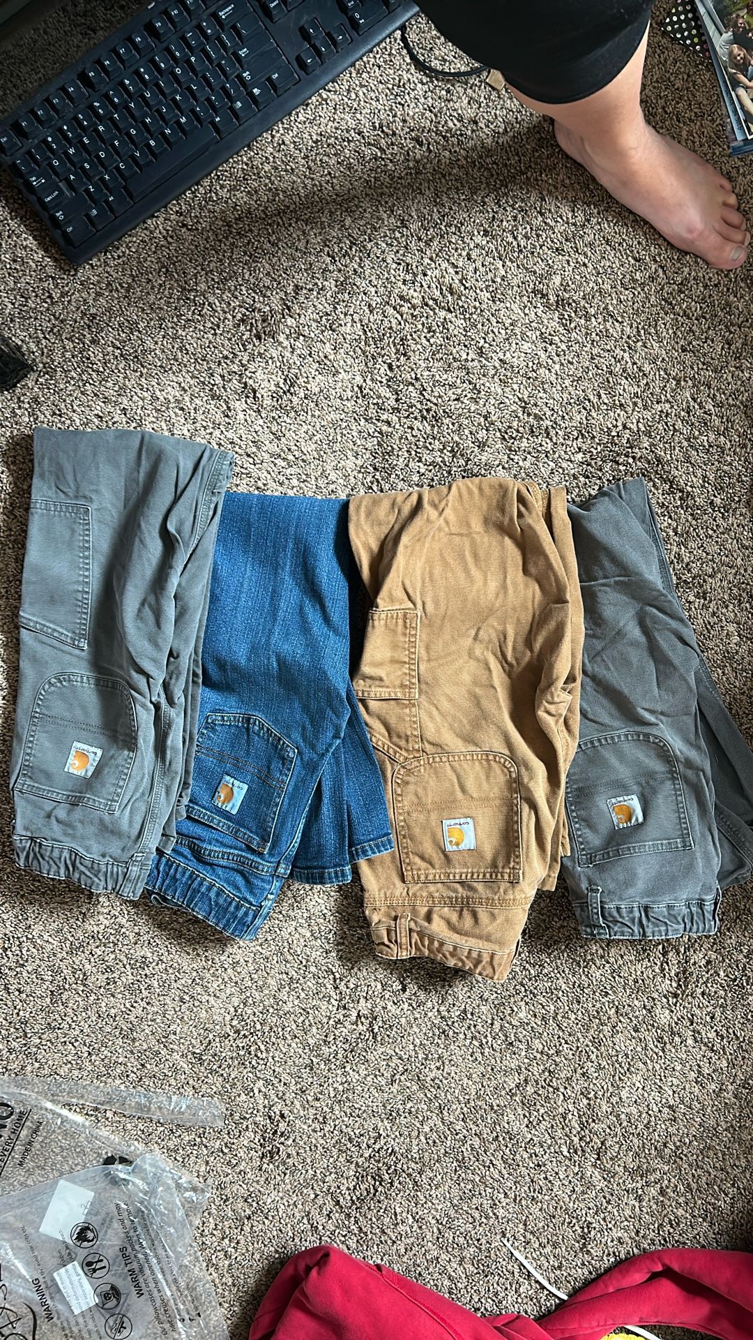 2 size 14 (brown and grey) 2 size 12 (denim and grey) In good used condition One small hole on back of size 14 grey thigh $12 each, buy all for $40