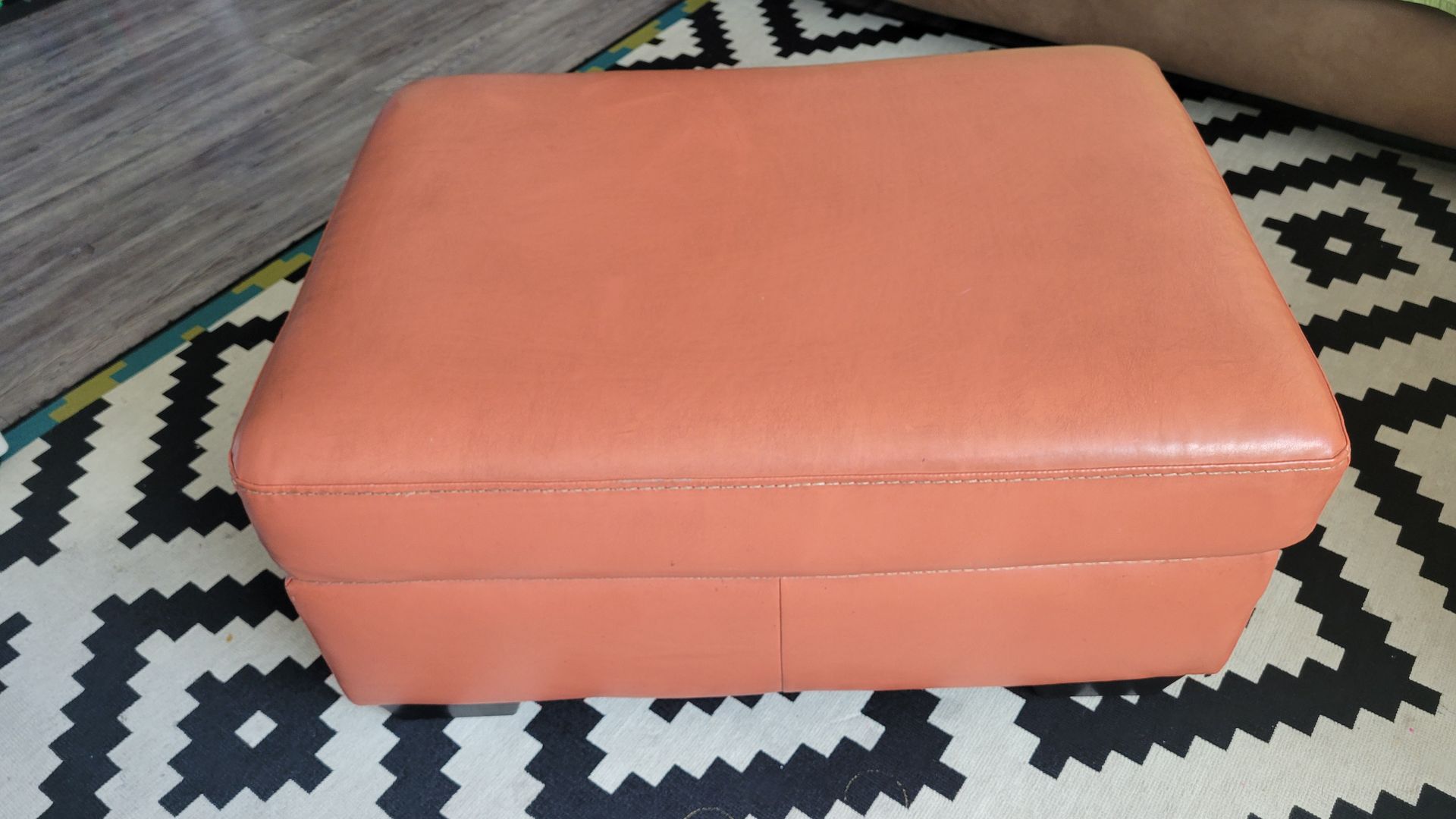Orange ottoman. Very soft made with pleather. Easy to clean and light given how cushionie it is.