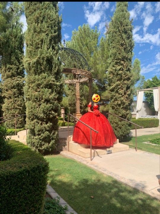 Nice red dress only worn 2 times! Sleeve does have a tear. Small size 6 also comes with the flowers