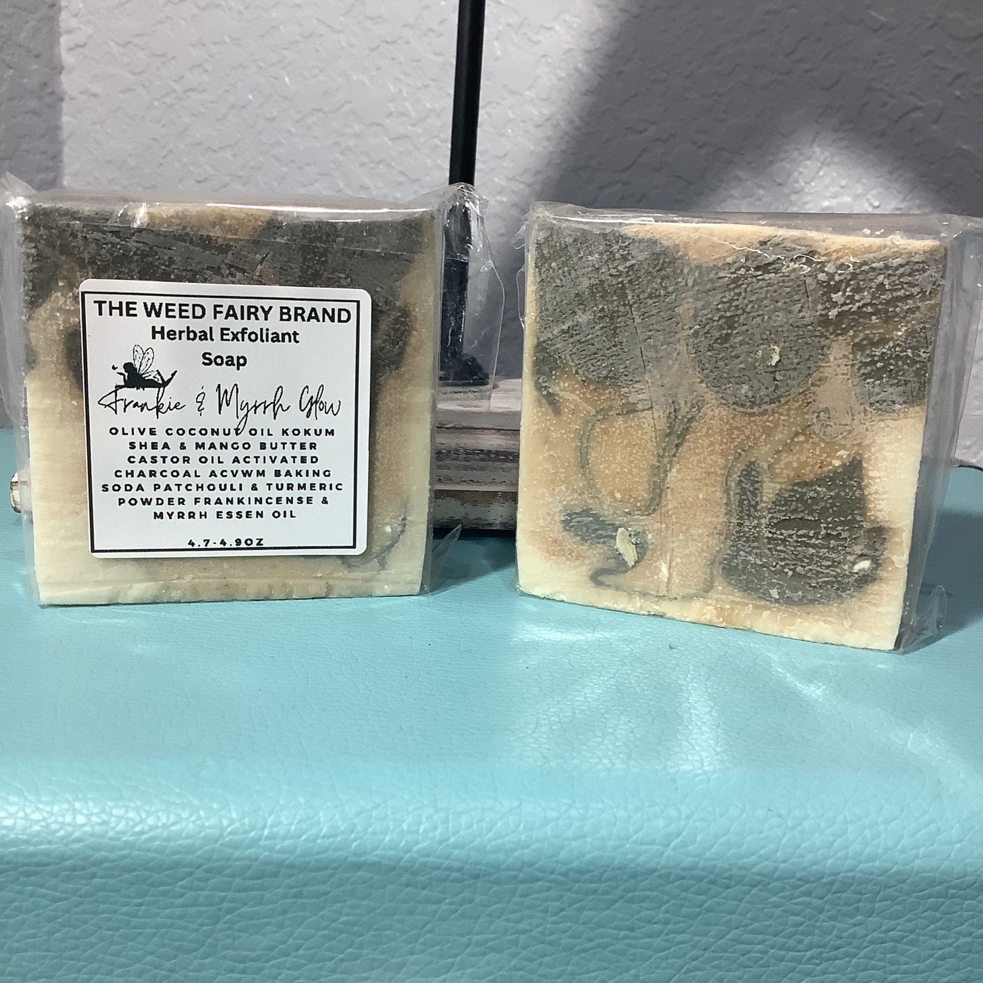 Frankie & Myrrh Glow is an natural herbal detox soap with a frankincense and myrrh essential Arabic oil infused. Ingredients are listed on the pictured item. The turmeric helps to brighten your skin. Has a light scent.