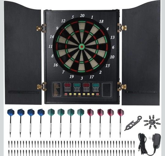 Electronic Dart Board Cabinet Set, LED Digital Electric Dartboard with Compressed Wooden Cabinet Door, Soft Tip Darts Board with 12 Darts, 88 Tips, 27 Games, 243 Variations, Up to 16 Players