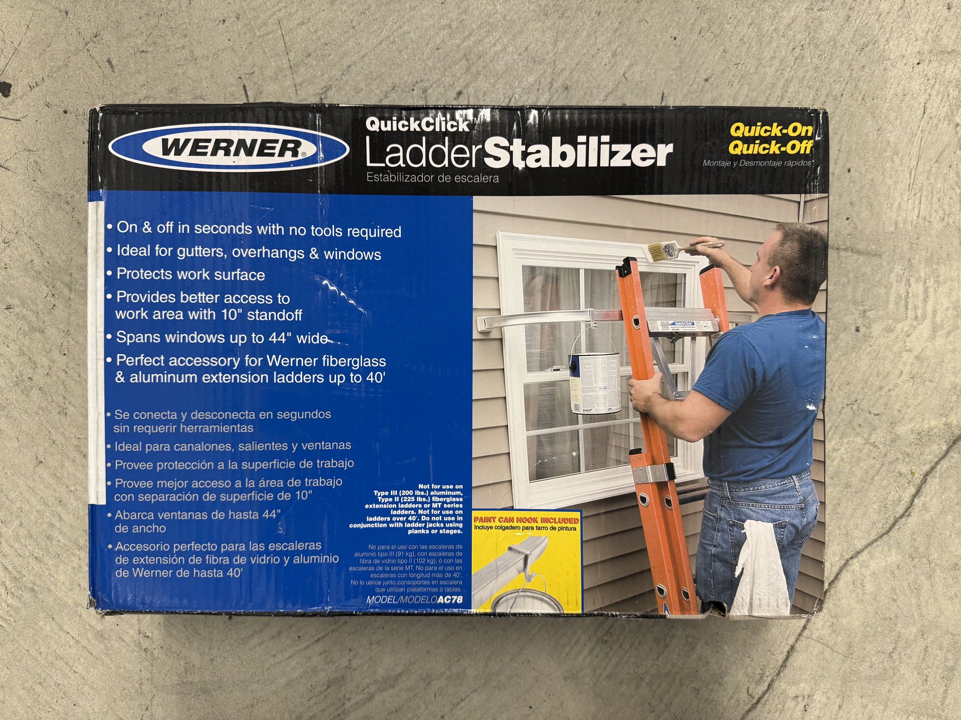 New Werner “Never Used/in box” QuickClick Ladder Stabilizer. This is model AC78. Super easy to use, attaches in seconds with no tools needed. Great for working on gutters, windows, and overhangs. It gives you a 10 inch standoff from the wall and spans windows up to 44 inches wide. Works with Werner fiberglass and aluminum extension ladders up to 40 feet. Has a paint can hook too!
