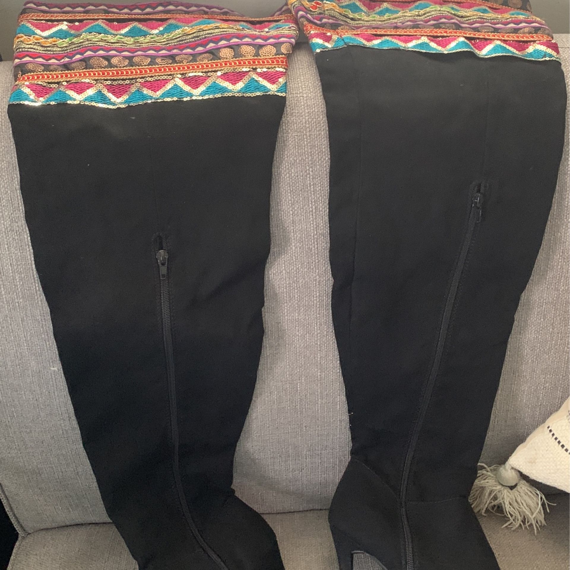 Size 8.5 2” heels color black: Beautifully hand embroidered boots with smooth suede liner and double long zipper facing inner of the boots. Never worn except tried on. Expecting can’t weary