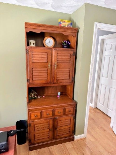 The Maple Wood Vintage Hutch is a versatile piece that can be used in the kitchen or office. It features a rectangular shape with beautiful wood doors, offering a stylish and functional storage solution. Made from durable maple material, this hutch includes 5 shelves and 1 drawer for added organization. With a tabletop width of 32 inches, 19 inches depth, and a height of 72 inches, this hutch is perfect for adults and can complement various room decor styles. Assembly is not required, making it a convenient addition to your home or office space. Good condition! #vintage, #rhodeisland, #homestorage #hutch