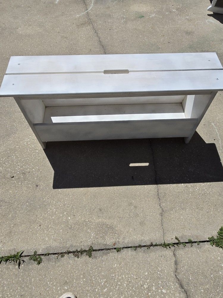 This is a really nice all wood bench with an opening below for extra storage. Made by IKEA, retails for $79. I painted it a chalky white color. In overall good used condition with some minor wear from age and use. 18H by 40L by 10W. $35, cash only.