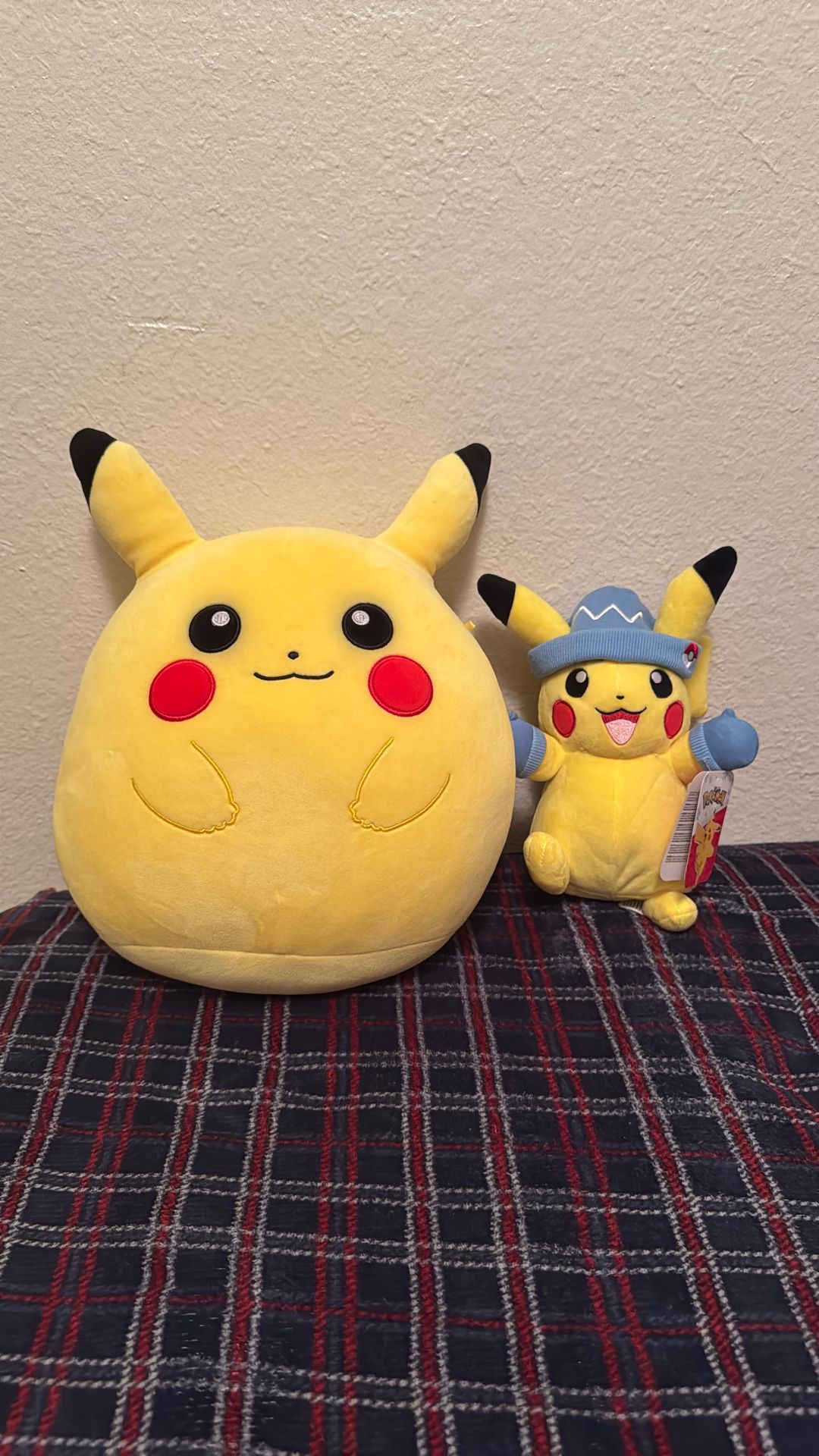 Charming Pikachu plush duo. soft and cuddly. Perfect for playtime and hugs