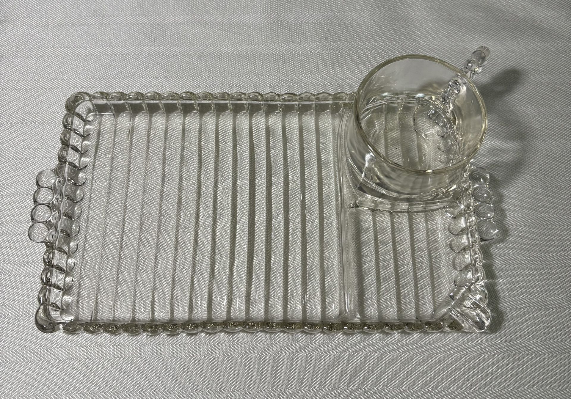 Hazel Atlas Sip N Smoke Snack Set 1940’s. Ball and Rib Design. This tray has a section for the cup and a section that functions as an ashtray. Excellent vintage condition, rare find. Seven sets available. $9 each, 2+ for $8, or all 7 for $49