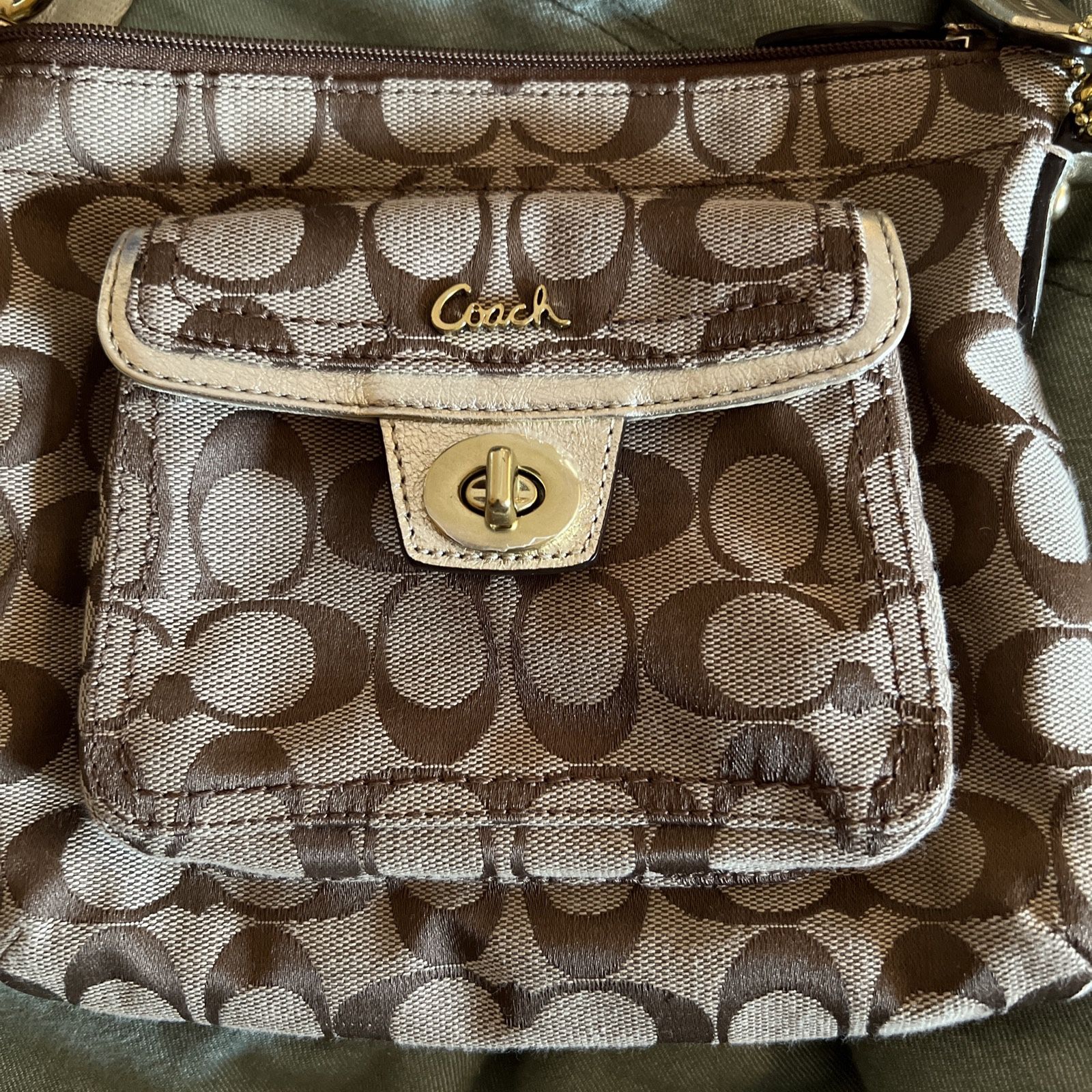 Bought New Worn Twice Coach Crossbody/Shoulder Bag in Signature Coach Logo Jacquard with front lockable pocket , metallic gold trim, adjustable fabric strap, Coach name in gold hardware, metallic gold keychain, removable strap on one side. Slight stains on back exterior- see photos. Slight discoloration on gold hardware - that particular discoloration was present when purchased. Non-smoking clean home! Length: 8” Height: 7” Thickness: 1”