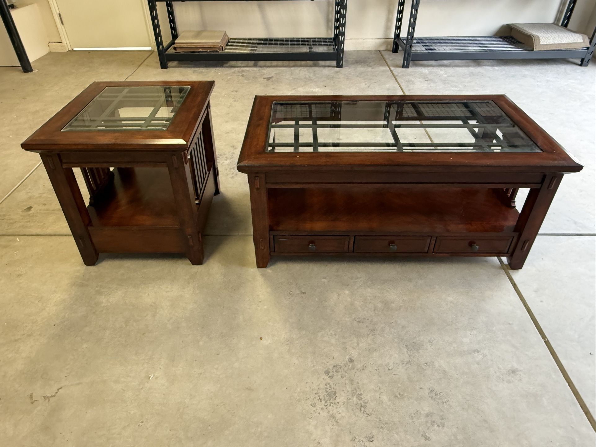 Broyhill Coffee table and side table purchased from Fashion Furniture in Fresno in 2008 (prior to Broyhill being bought out). I still have the receipt. They are solid, nice pieces of wood and metal and glass tops with a deep cherry to medium-brown finish. There is a small scratch on the glass on the coffee table and small nicks (see pictures). Dimensions are 28” x 48” for coffee table and 23” x 27” for side table. Purchased as a set, it would be $350. You are welcome to stop by and see them prior to deciding on whether or not to purchase.