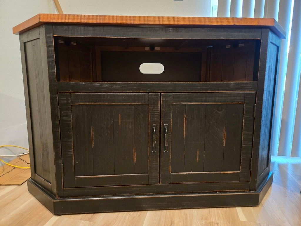 Distressed brown and black TV console. Corner cabinet with shelf and doors. Fit 55" TV. W 49.. D 19 .. H 31