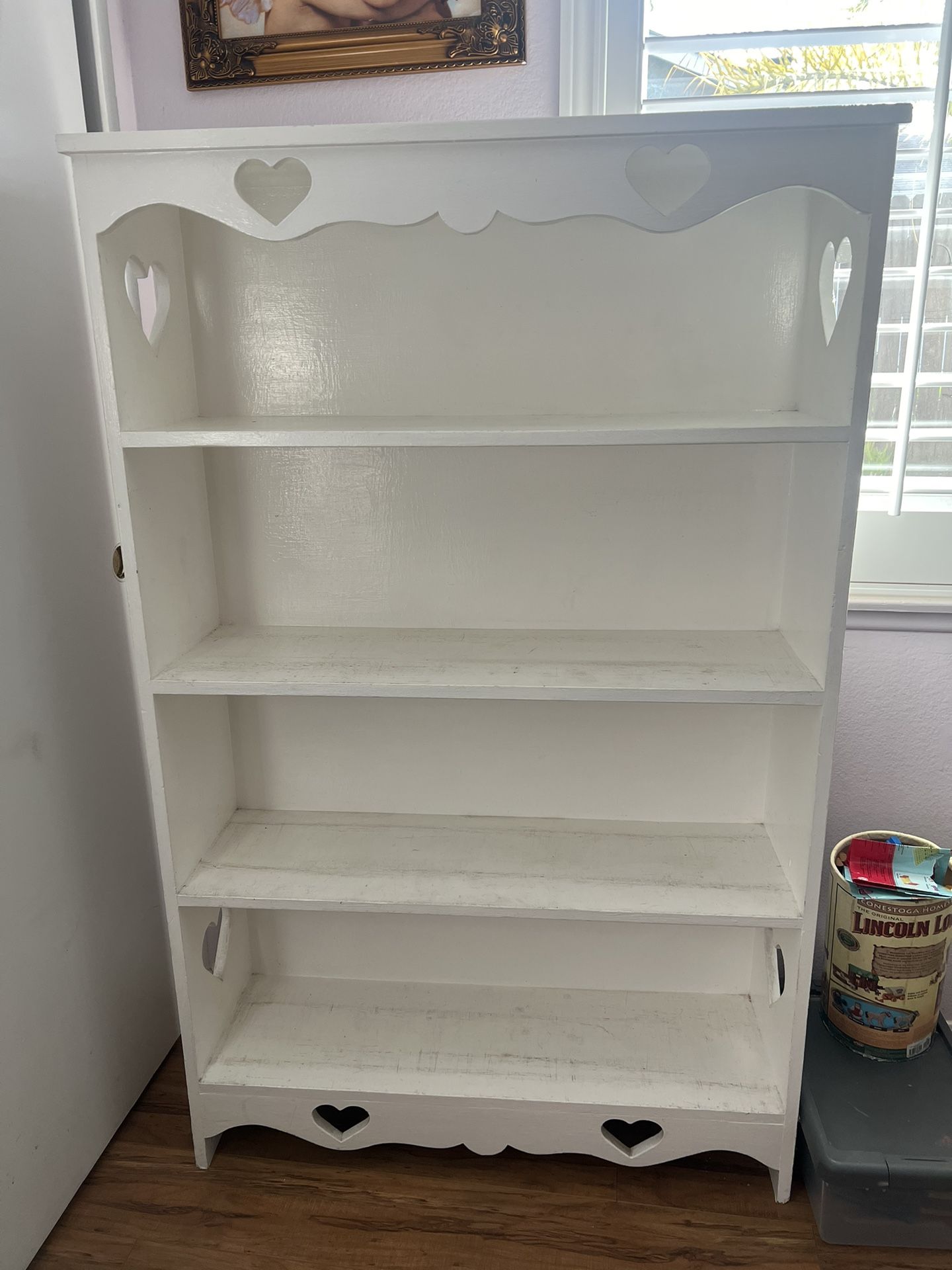 Beautiful heart accented white bookcase 3’ wide by 4’11”