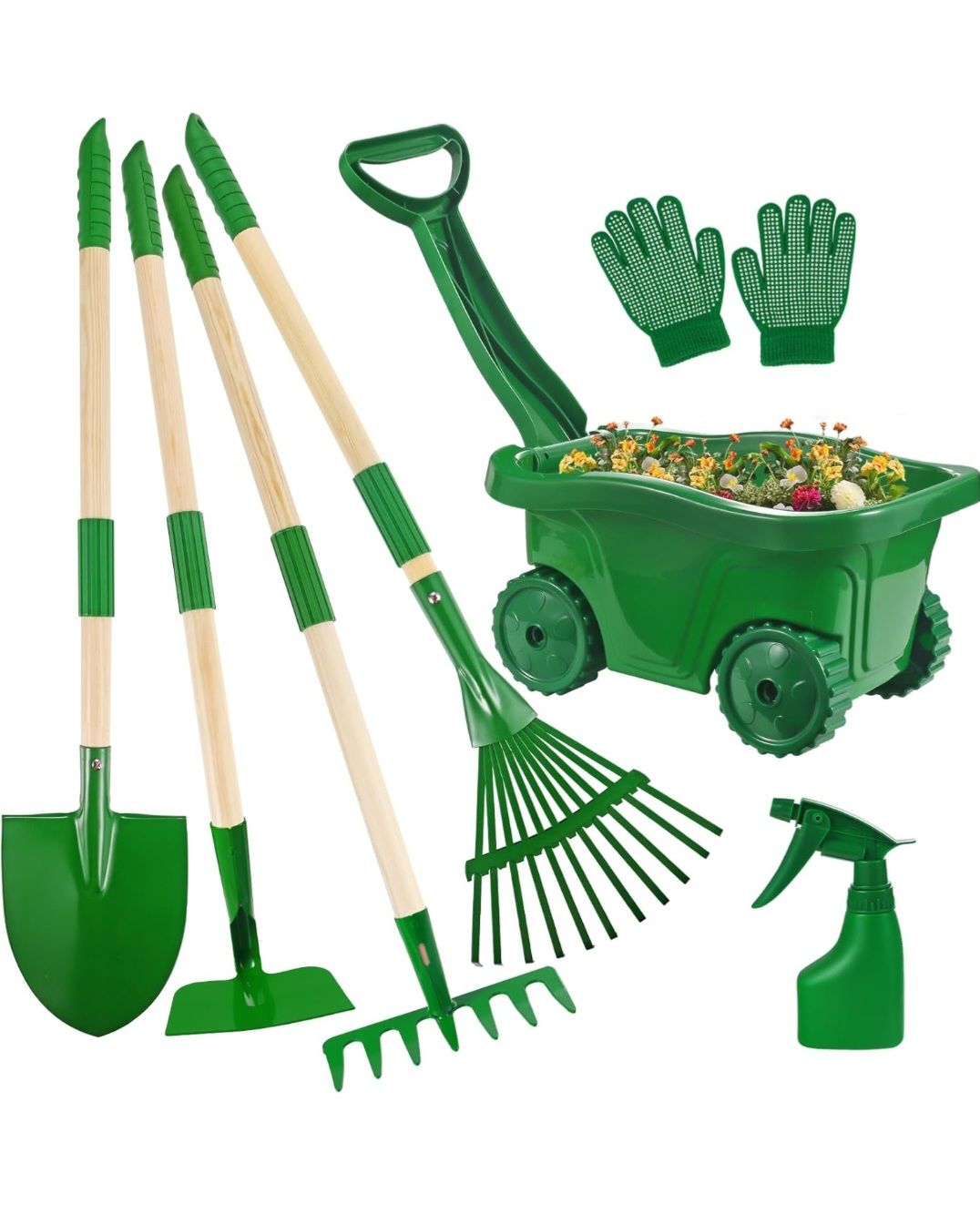Duckura Kids Gardening Tools Set - 7pcs Wheelbarrow Set for Kids with Shovel, Rake, Leaf Rake, Summer Outdoor Yard Digging Weed Birthday Gifts Toys, Easter for Boys Girls Age 2 3+ Years(Green) 7 PCS KIDS GARDEN TOOLS: Toddler gardening tools set include Shovel, Rake, Hoe, Leaf Rake, Wheelbarrow, kids custom gloves and a spray bottle (3 morphological transformations). Children's custom gloves are perfect for protecting their hands from injury while gardening activities! QUALITY MATERIAL& SAFE: Our Handles are made of imported pine wood, the garden tools head is supported by solid iron pieces and sprayed with environmental protection. these tools are sturdy enough for actual digging, and kids to play outdoors well, such gardens, farms, yard, snow, beach etc ERGONOMIC DESIGN FOR CHILDREN: The length of the children's gardening shovel set is 70cm(27.5in), which is a regular size suitable for most children. The handle is equipped with hanging holes and a middle connector that can be detached for easy suspension and storage. Note: the connector needs to rotate to the bottom without leaving gaps during use SKILLS & EDUCATIONAL: Kids Yard Tools help improve hands-on skills. It also helps kids to develop a sense of nature, learn about plants while they grow flowers or help parents do garden work. Perfect to turn gardening into family fun and get kids out and away from electronics screens